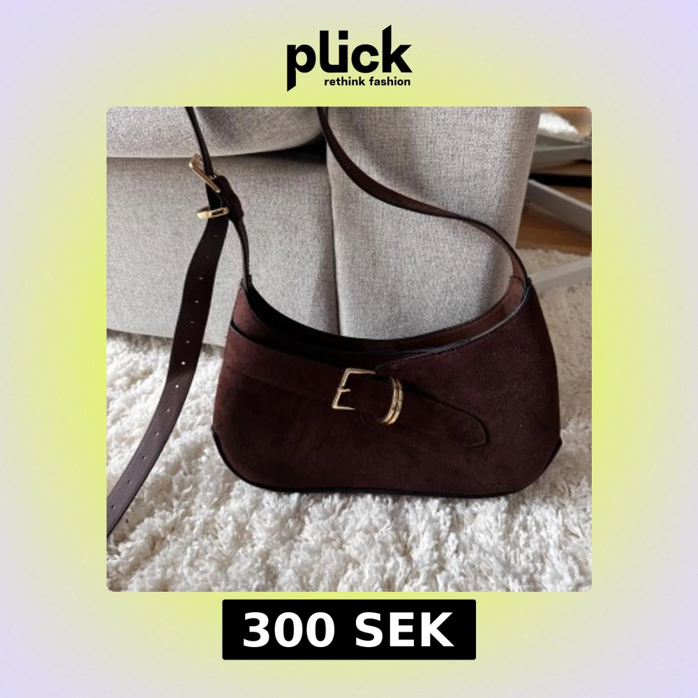 Snygg brun axelväska i mocka med justerbart axelband och guldfärgat spänne framtill. Väskan har en mjuk, rundad form och stängs med magnetlås. Insidan har ett fack med dragkedja för småsaker. Perfekt för dig som gillar stilrena detaljer.
