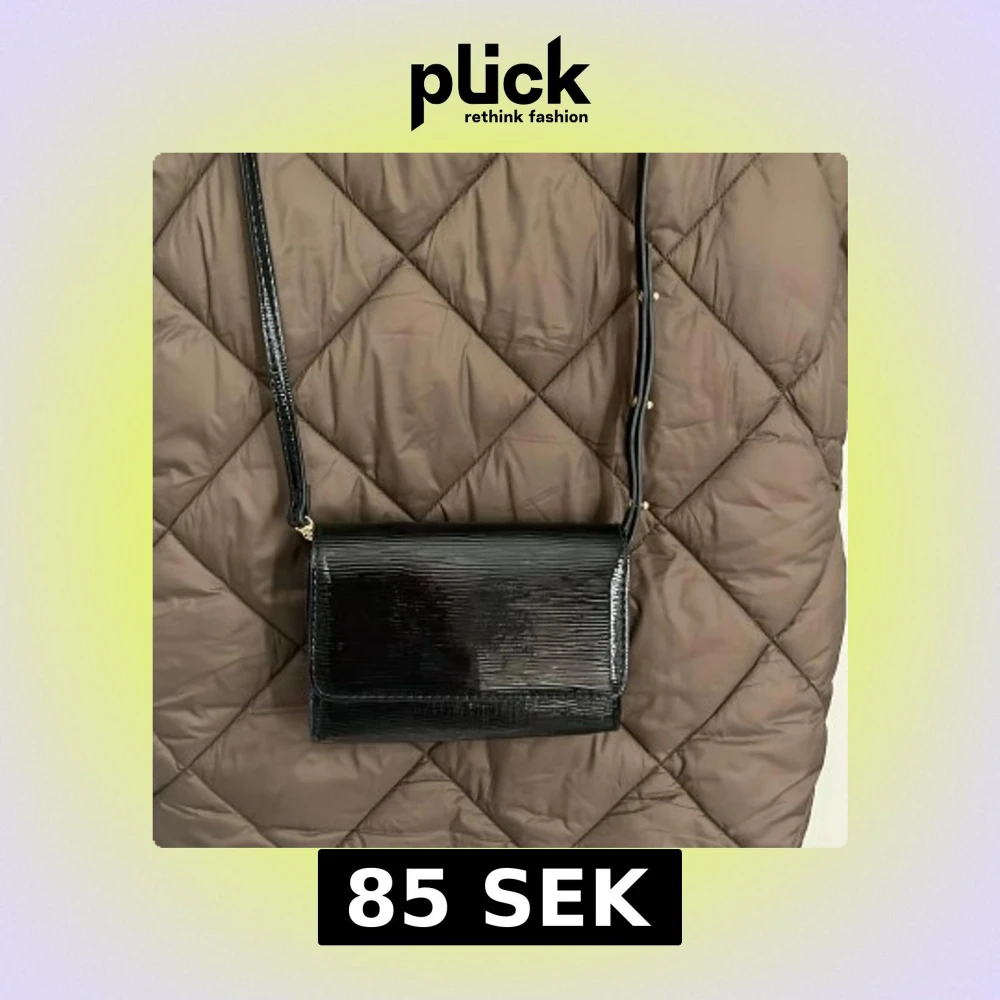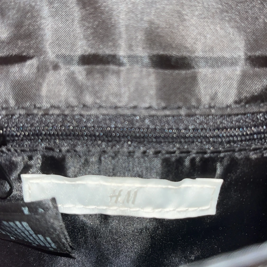 Snygg svart axelväska från H&M i glansigt material med struktur. Väskan har justerbart axelband och stängs med lock. Perfekt för att bära det viktigaste till vardags eller när du vill ha en stilren look.
