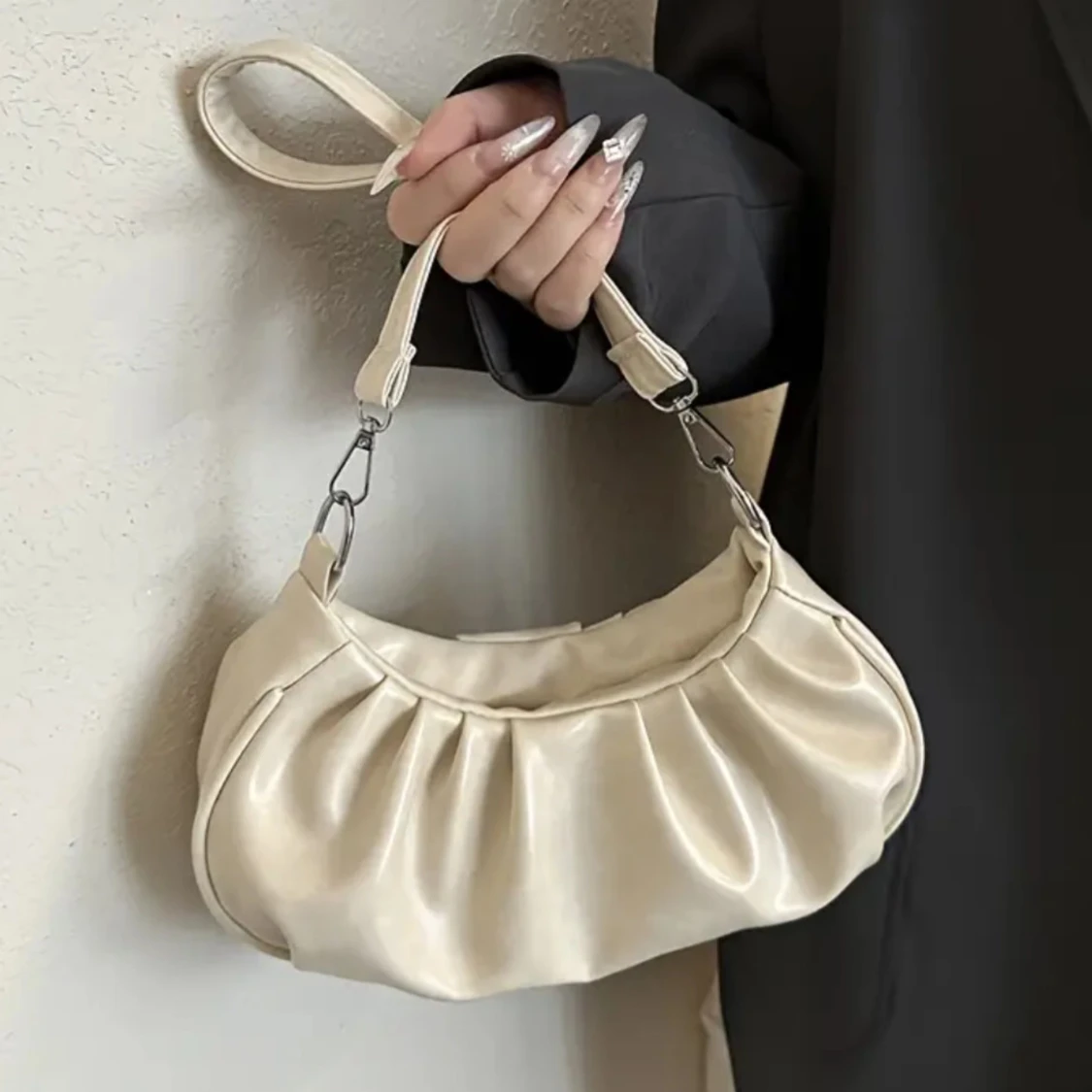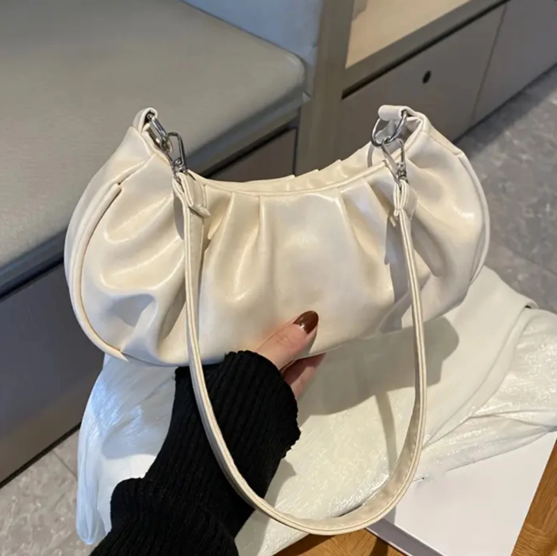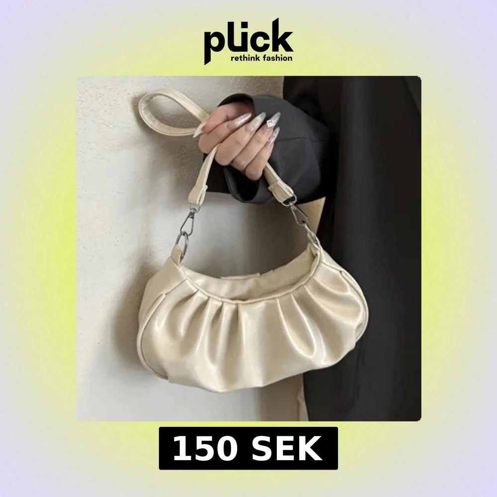 Trendig axelväska i krämvitt syntetmaterial med snygga rynkade detaljer. Väskan har en avtagbar axelrem med silvriga metalldetaljer och en mjuk, rundad form som ger en cool och modern vibe.
