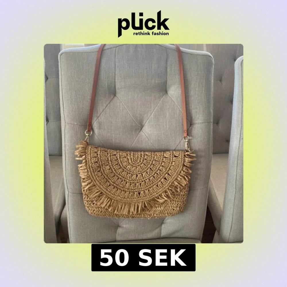 Säljer en snygg beige axelväska i flätad strå med dekorativa fransar och brunt axelband. Perfekt för sommarens alla äventyr och ger en bohemisk touch till din outfit. Väskan har ett halvmåneformat lock och är lätt att bära med sig.