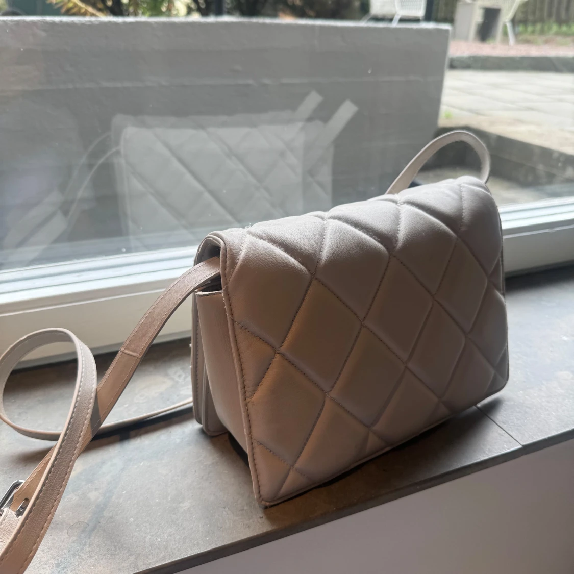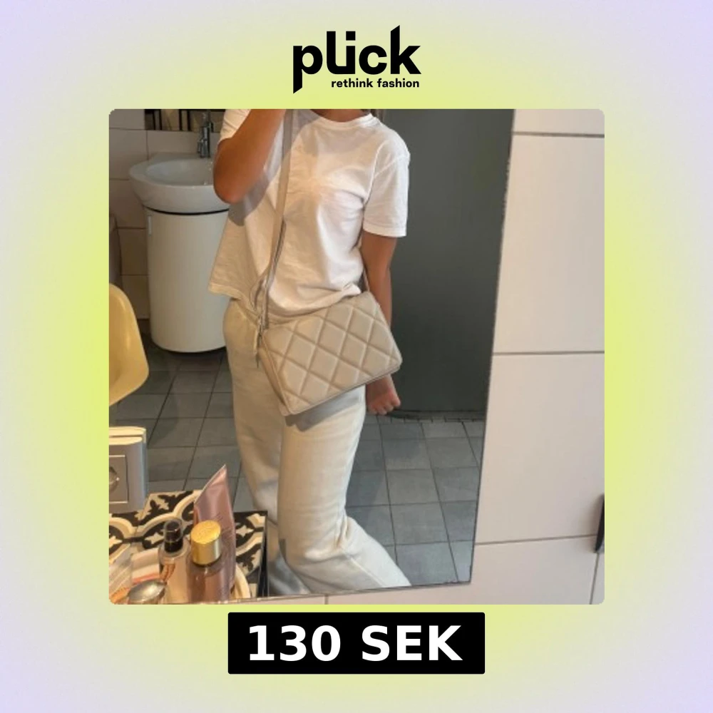Säljer en stilren beige axelväska med lång rem. Väskan har en mjuk, vadderad känsla och är perfekt för att bära det viktigaste. Enkel och snygg design som passar till många outfits.