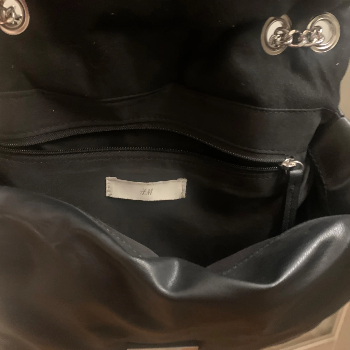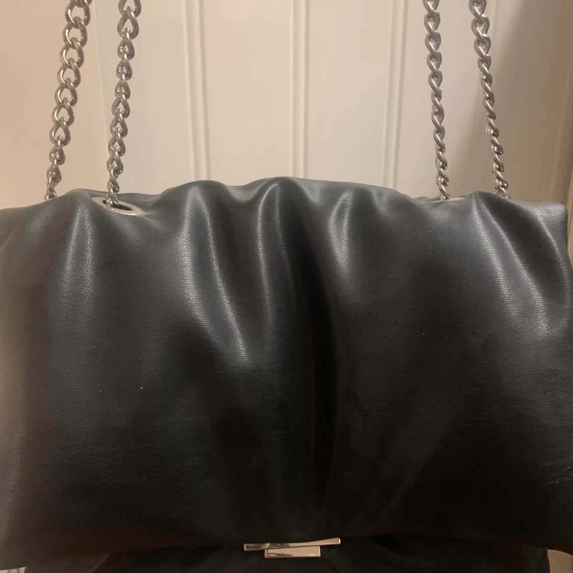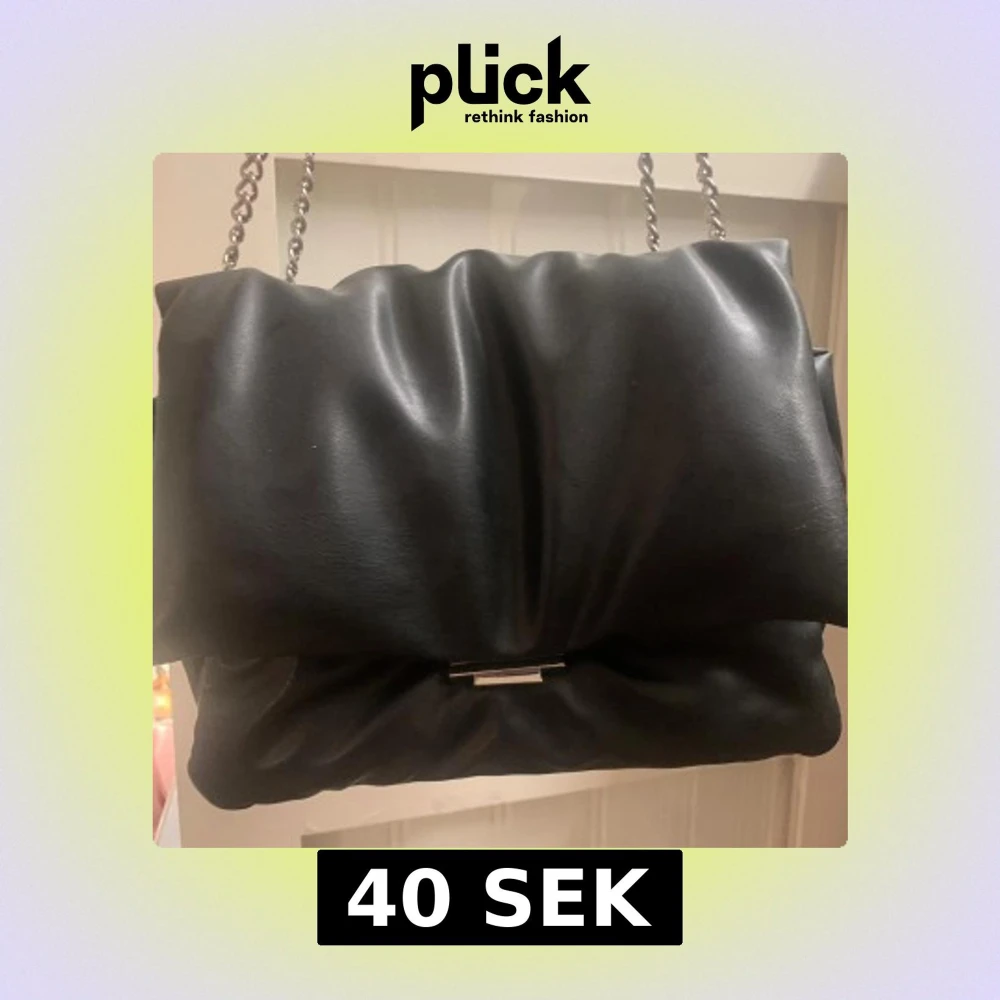 Säljer en svart axelväska från H&M i mjukt skinn med puffig design. Väskan har en silverfärgad kedjerem och ett stilrent metallspänne framtill. Insidan har dragkedjefack för småsaker. Perfekt för dig som gillar en trendig och clean look.
