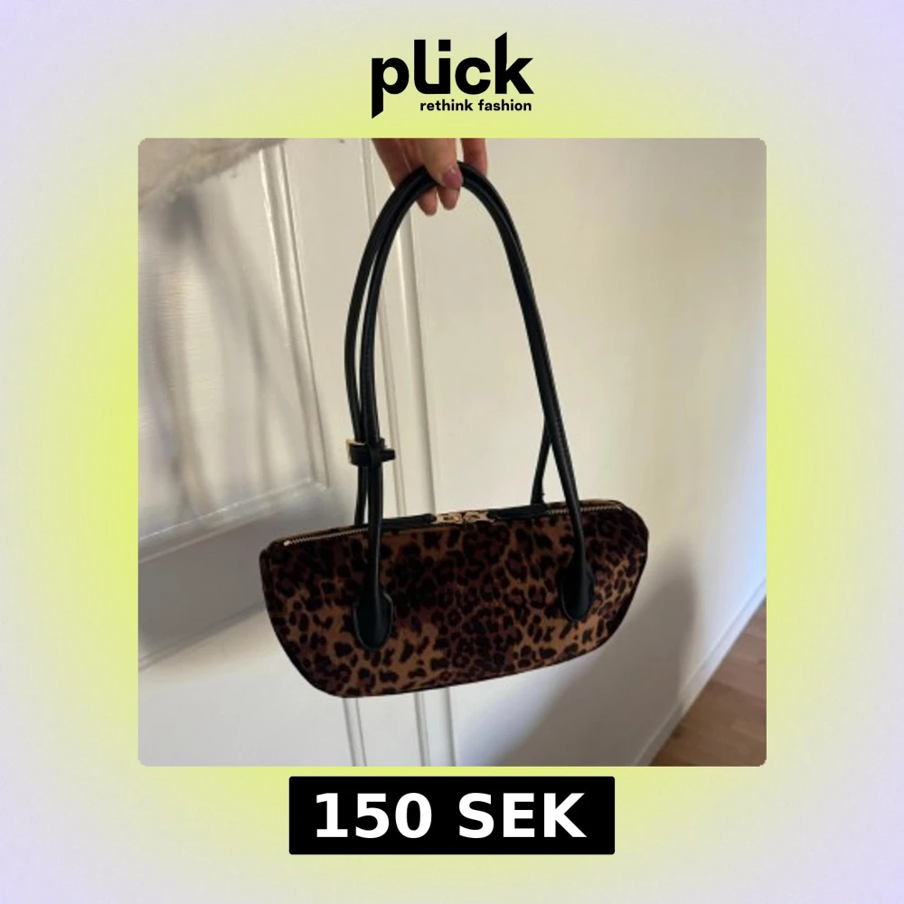 Säljer en snygg axelväska med leopardmönster, svarta handtag och guldiga detaljer. Väskan har dragkedja upptill och en avlång form. Perfekt för att lyfta vilken outfit som helst.