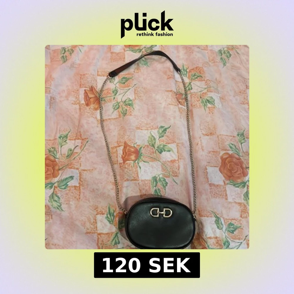Snygg oval axelväska från H&M i svart skinnimitation med guldfärgad kedjerem och dekorativt metallspänne framtill. Väskan har dragkedja upptill och en stilren look som passar till många outfits. Perfekt storlek för det viktigaste. Max använd 3 gånger