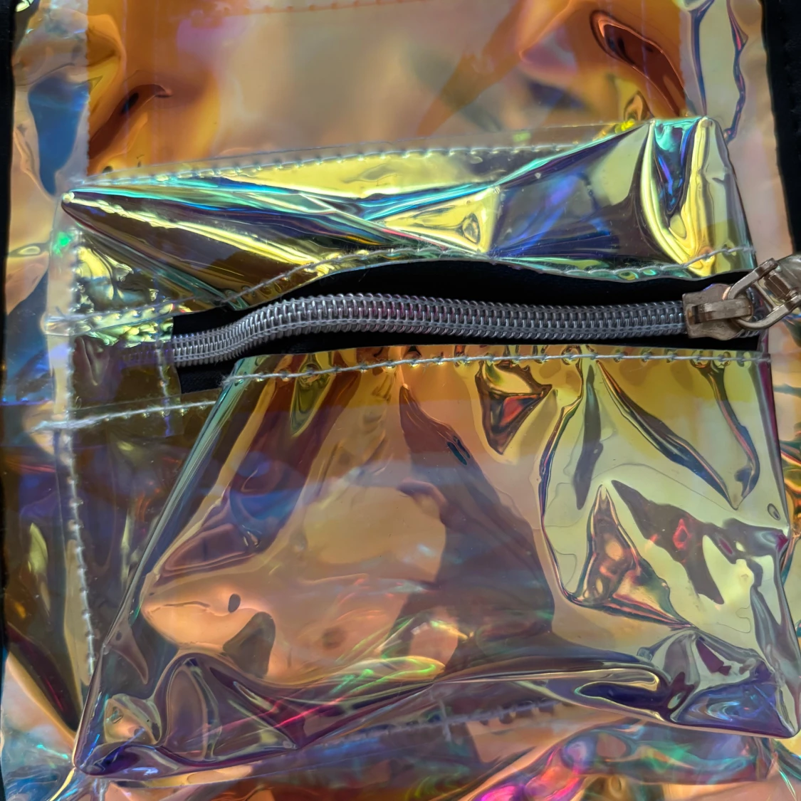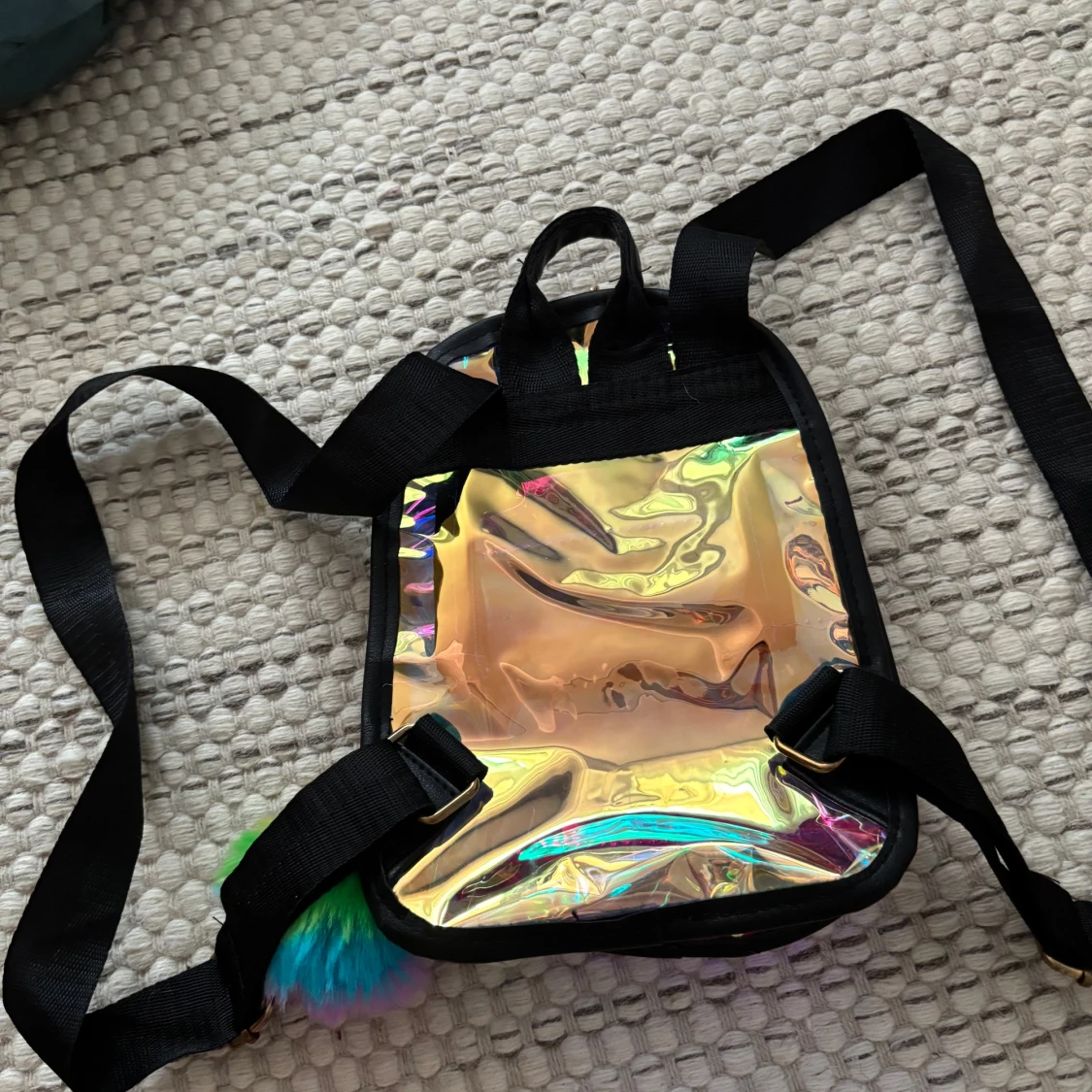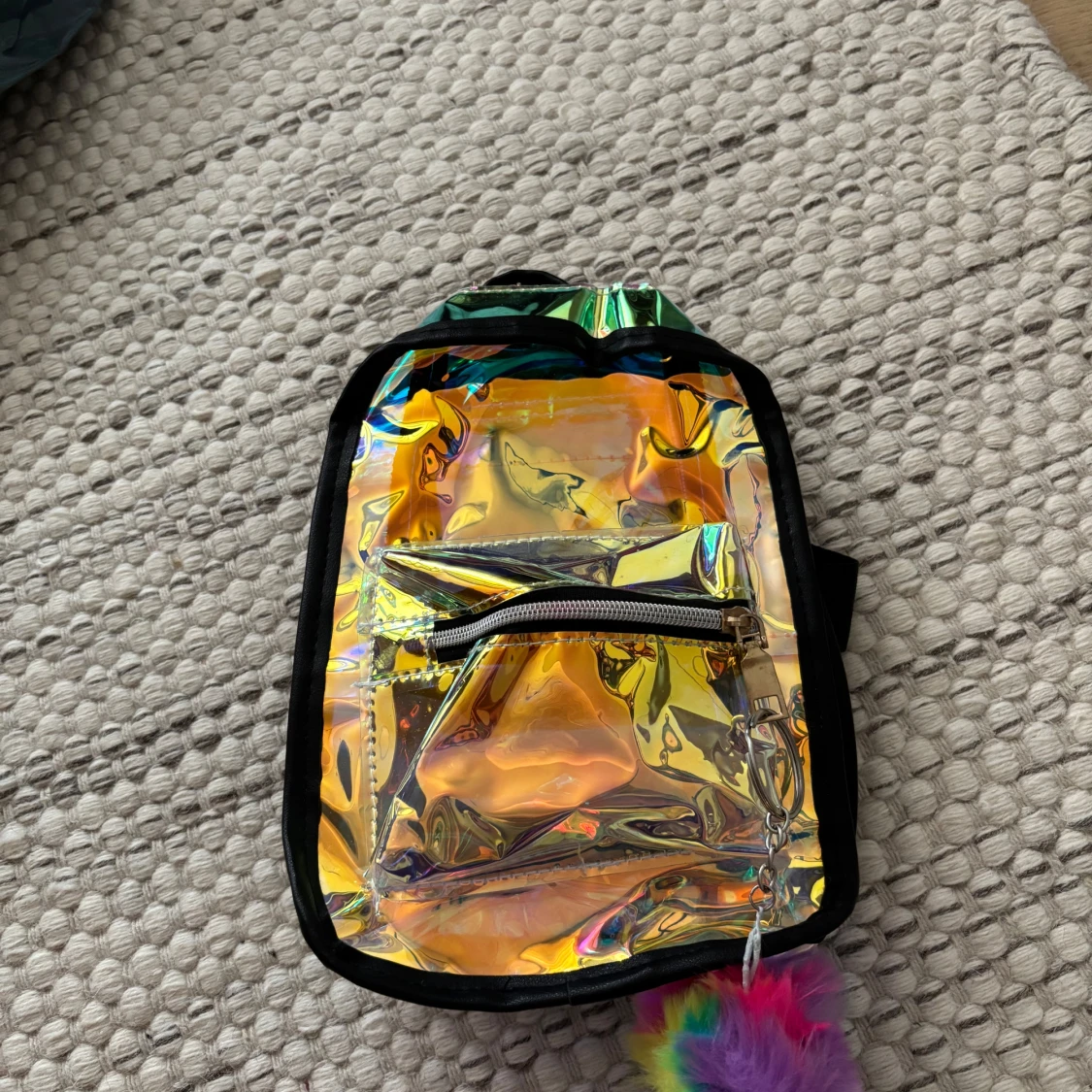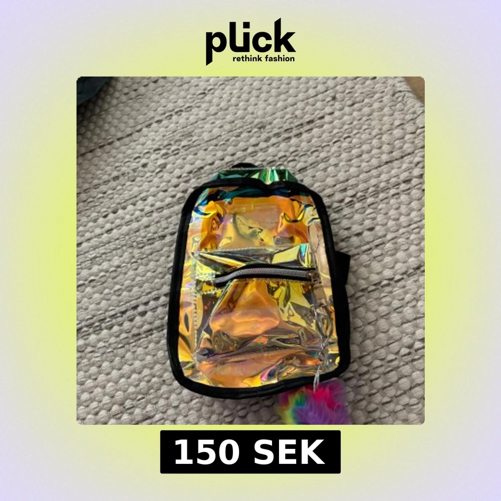 Säljer en liten ryggsäck i holografiskt syntetmaterial med regnbågsskimrande yta och svart kant. Väskan har justerbara svarta axelband, ett ytterfack med dragkedja och en fluffig regnbågsfärgad nyckelring. Perfekt för dig som gillar färg och vill sticka ut. Köpt på Kawaii. Pris kan diskuteras.