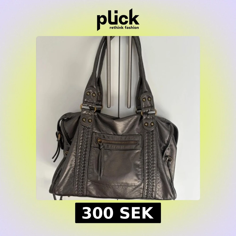 Snygg silvrig handväska med flätade detaljer och dekorativa nitar. Väskan har en praktisk framficka med dragkedja och rejäla handtag. Perfekt storlek för att få plats med allt du behöver och ger en cool touch till din outfit.