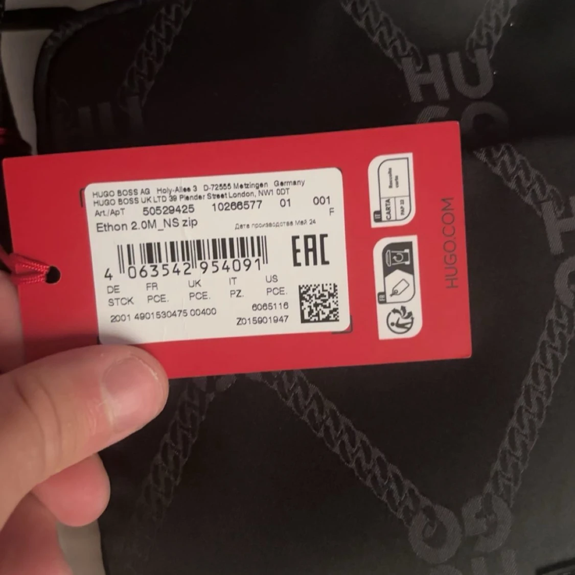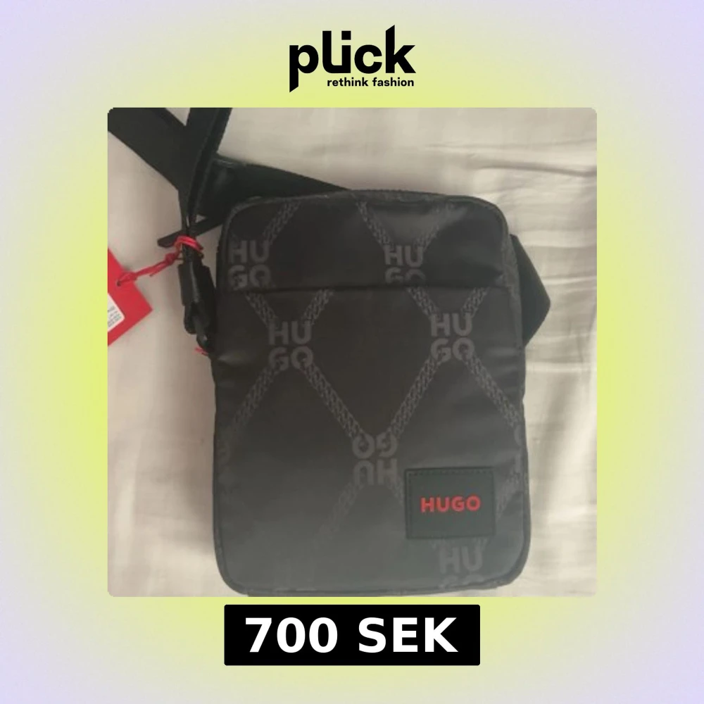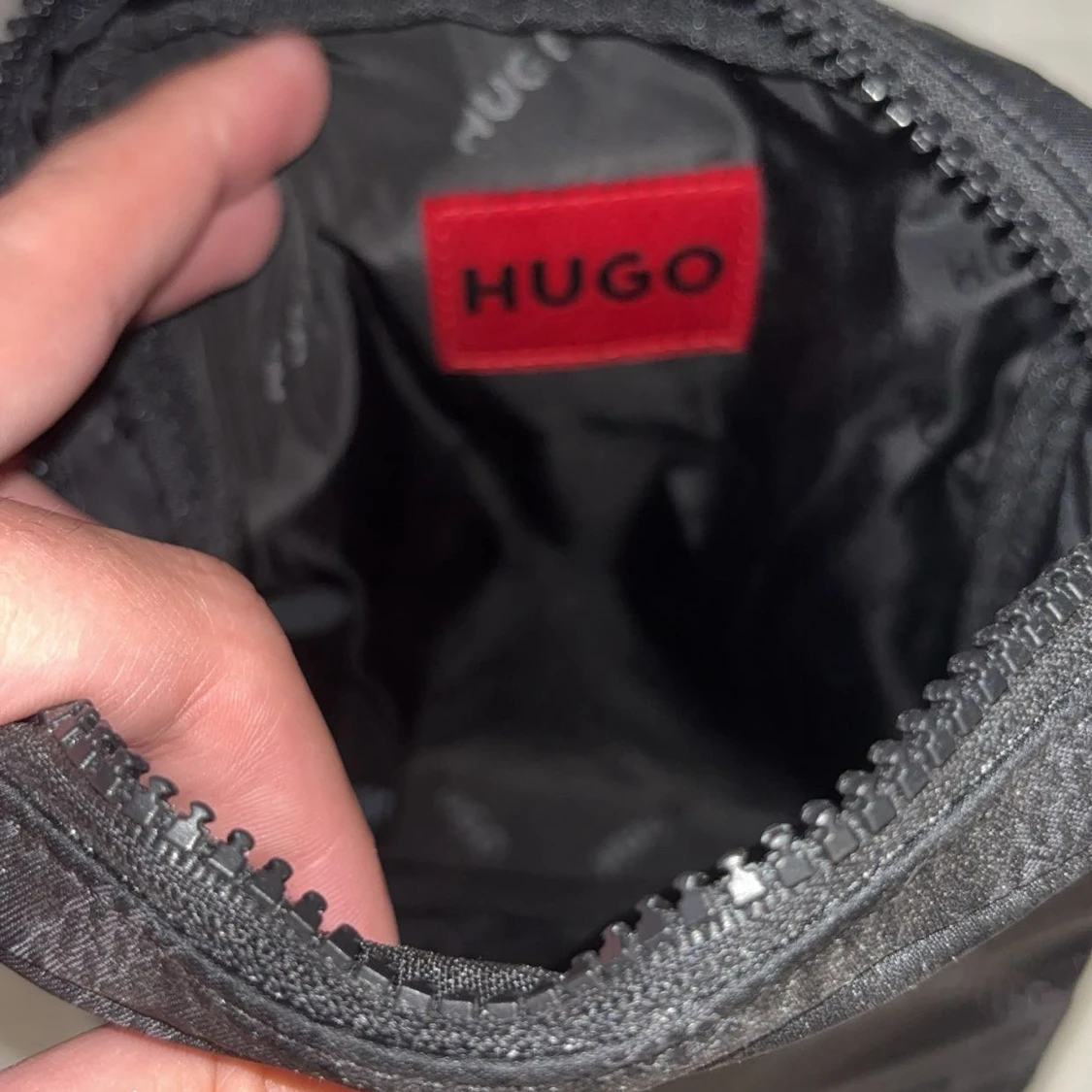 Snygg svart axelväska från Hugo med logomönster och röd Hugo-detalj framtill. Väskan har justerbar axelrem, dragkedja upptill och är tillverkad i slitstark polyester. Perfekt storlek för mobil, plånbok och andra småsaker.