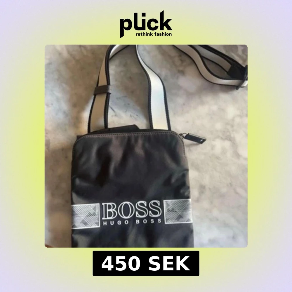 Snygg svart axelväska från Hugo Boss med vitt logotryck framtill och justerbart axelband i svart och vitt. Väskan har dragkedja upptill och ett innerfack med dragkedja. Perfekt storlek för mobil, plånbok och andra essentials.