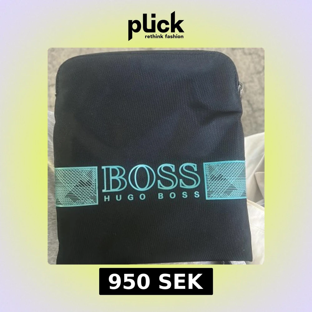 Snygg svart axelväska från Hugo Boss med justerbar rem och dragkedja upptill. Framsidan har ett turkost Boss-tryck och grafiska detaljer. Väskan är tillverkad i slitstark polyester och har en stilren, rektangulär form som passar perfekt för dina essentials.