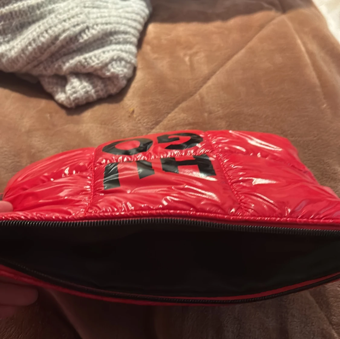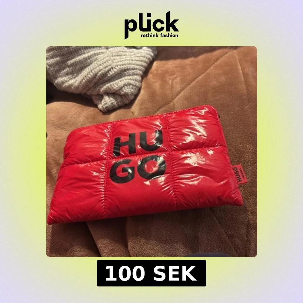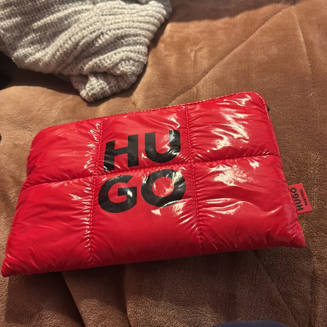 Snygg röd quiltad kuvertväska från Hugo boss med dragkedja. Den har en glansig yta och stor logotyp på framsidan. 100kr