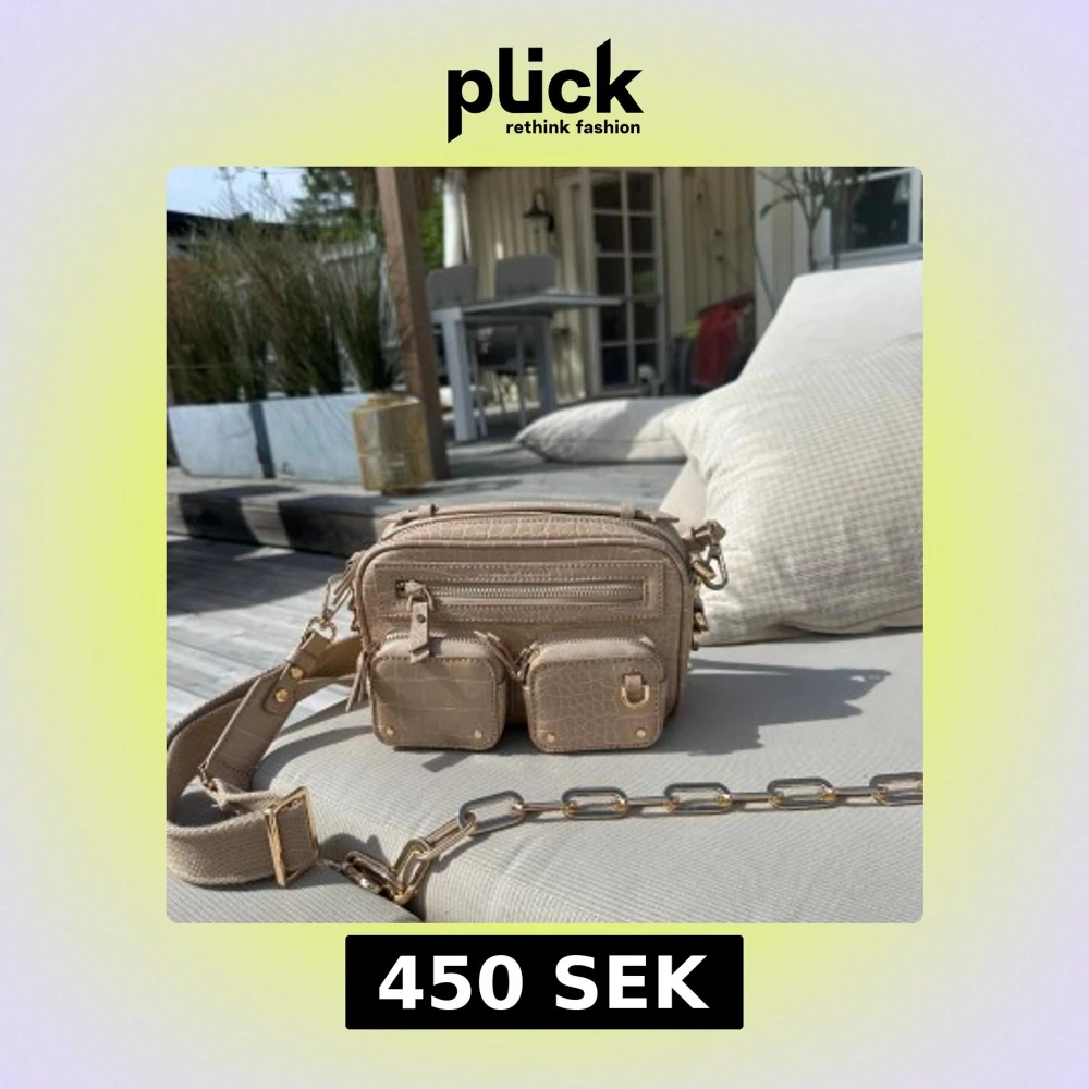 Snygg beige axelväska med krokopräglat mönster och guldfärgade detaljer. Väskan har flera fack med dragkedja och två små avtagbara fickor framtill. Bred justerbar axelrem i textil och kedjedetalj. Perfekt för dig som vill ha både stil och funktion.