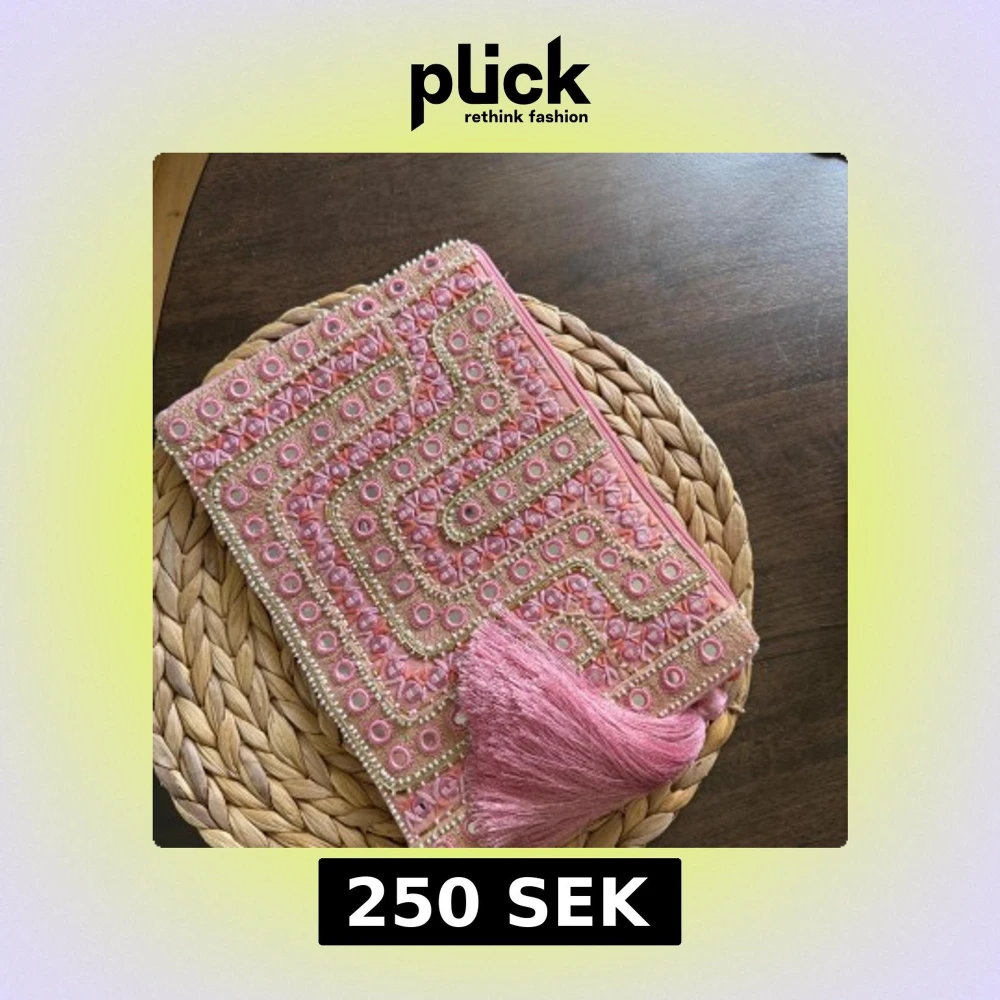 Superfin kuvertväska i rosa med broderade detaljer i guld och pärlor. Väskan har ett snyggt geometriskt mönster på framsidan och en stor rosa tofs vid dragkedjan. Perfekt storlek för mobilen och det viktigaste. Mjuk bomullskänsla och helfärgad baksida.