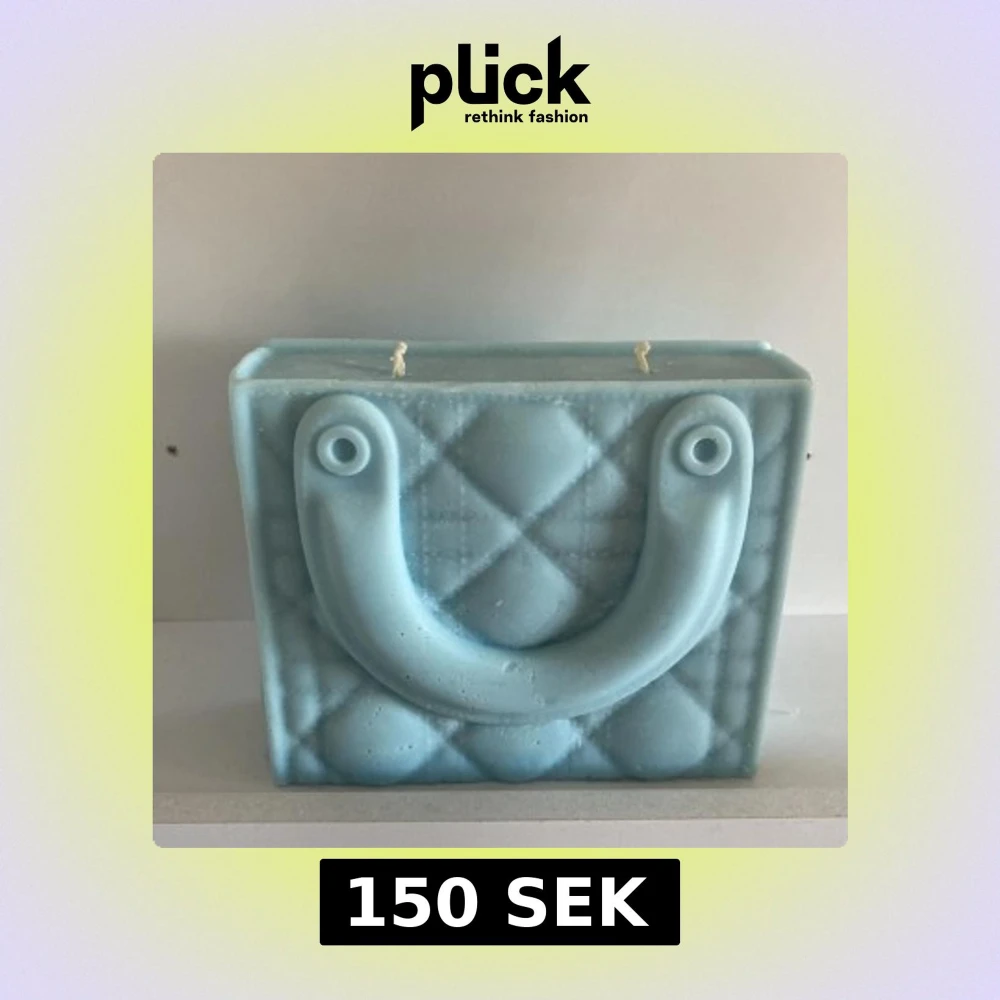 Säljer en ljusblå handväska handgjord i stearin, ny. Perfekt i stilren inredning. Ser ut som dior väskan