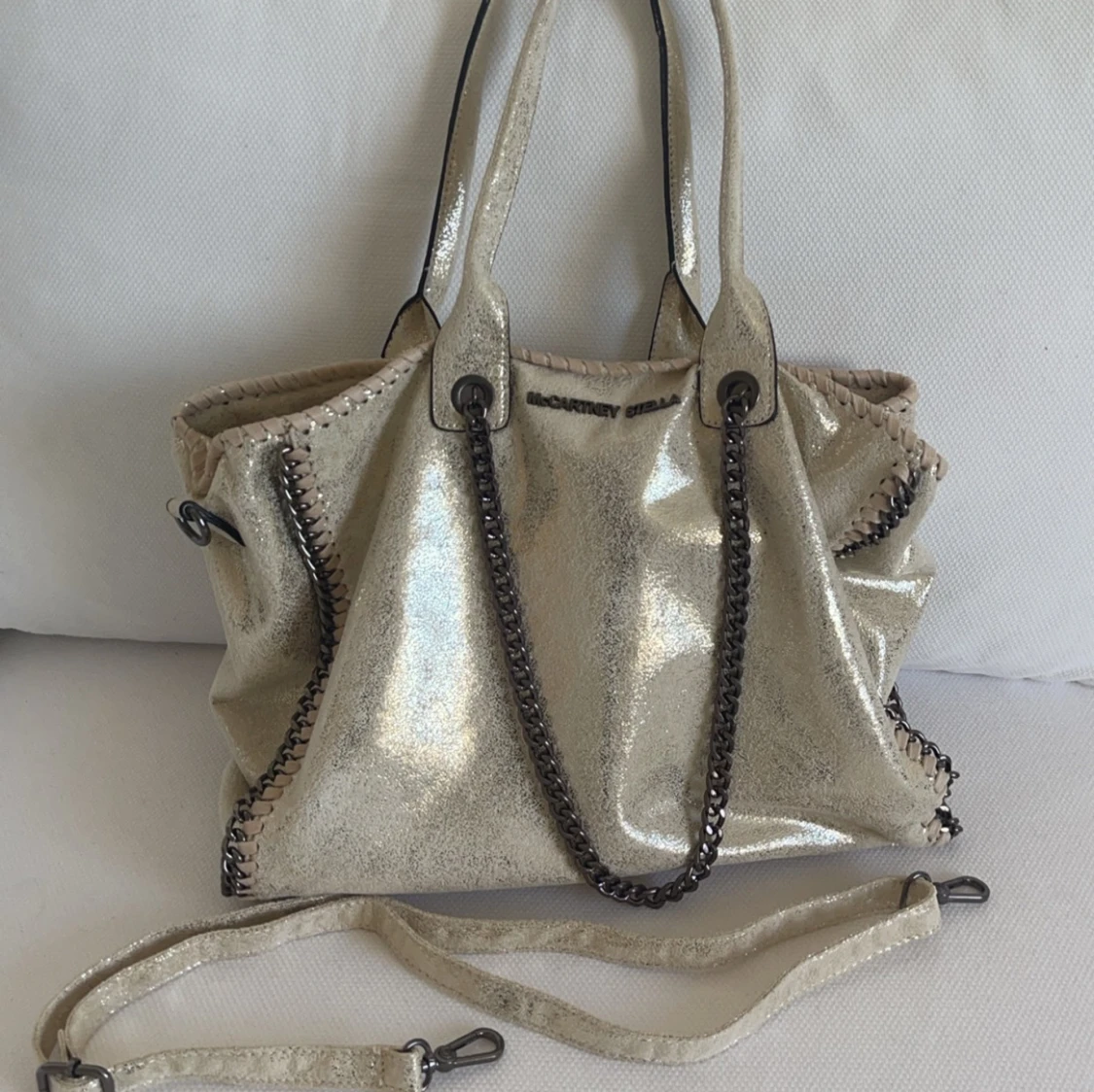 INTRESSEKOLL på min mammas gamla stella McCartney väska, perfekt till alla tillfällen och har så mycket plats, inga defekter alls och ser ut som ny, champange färgad med det finaste skimret!!❣️❣️
