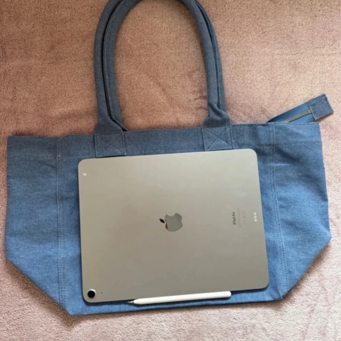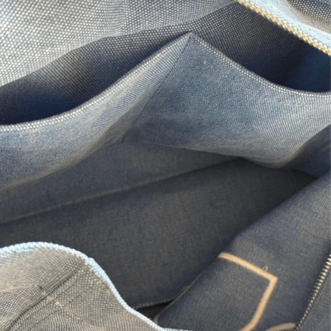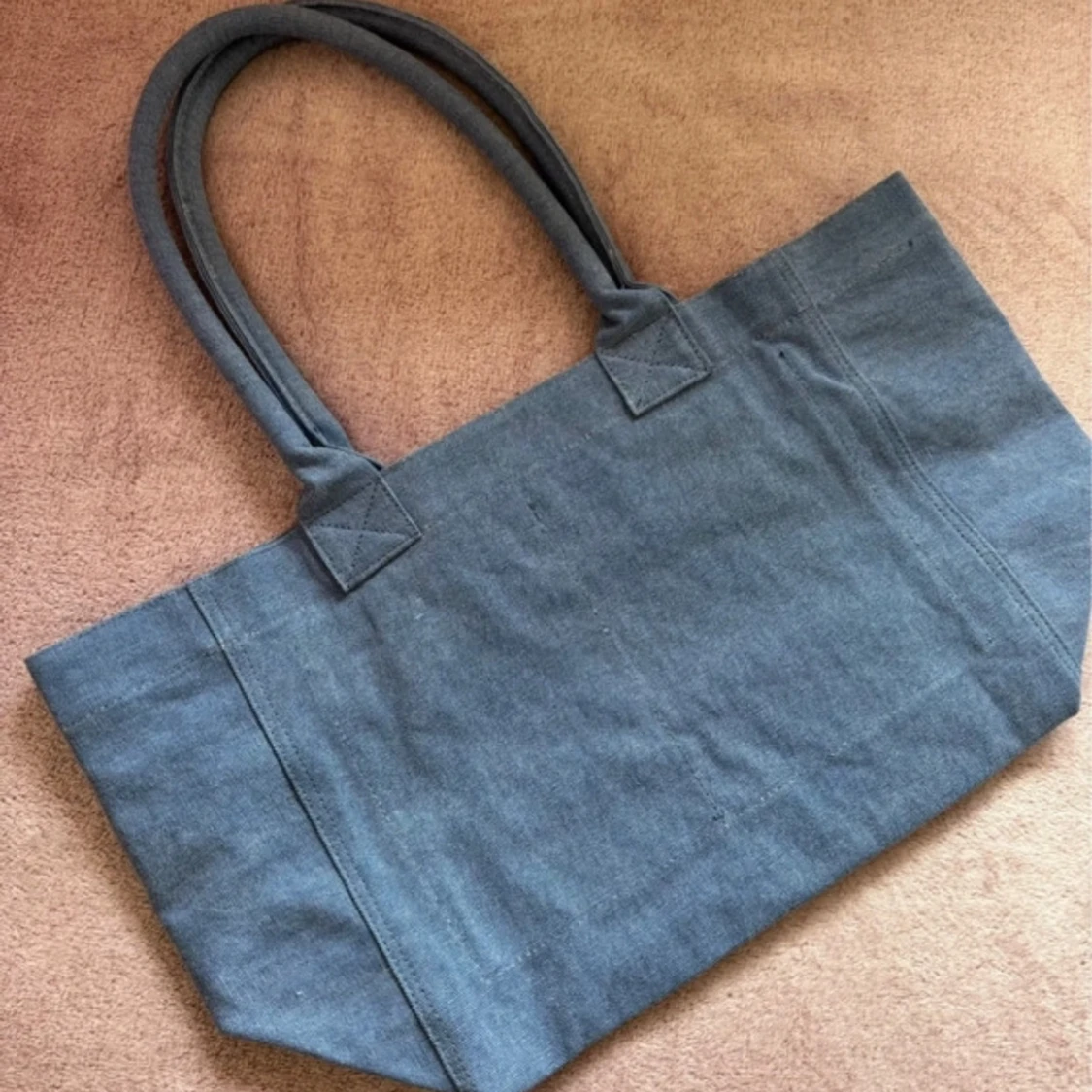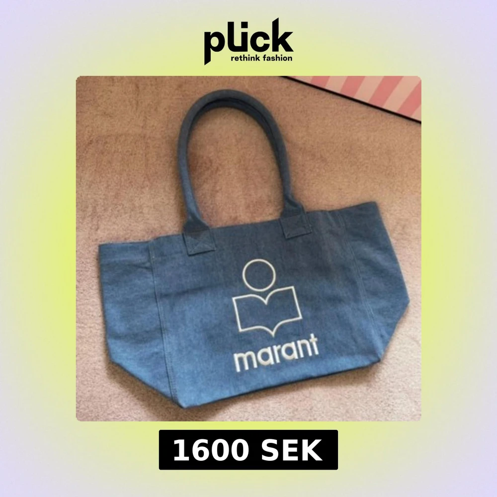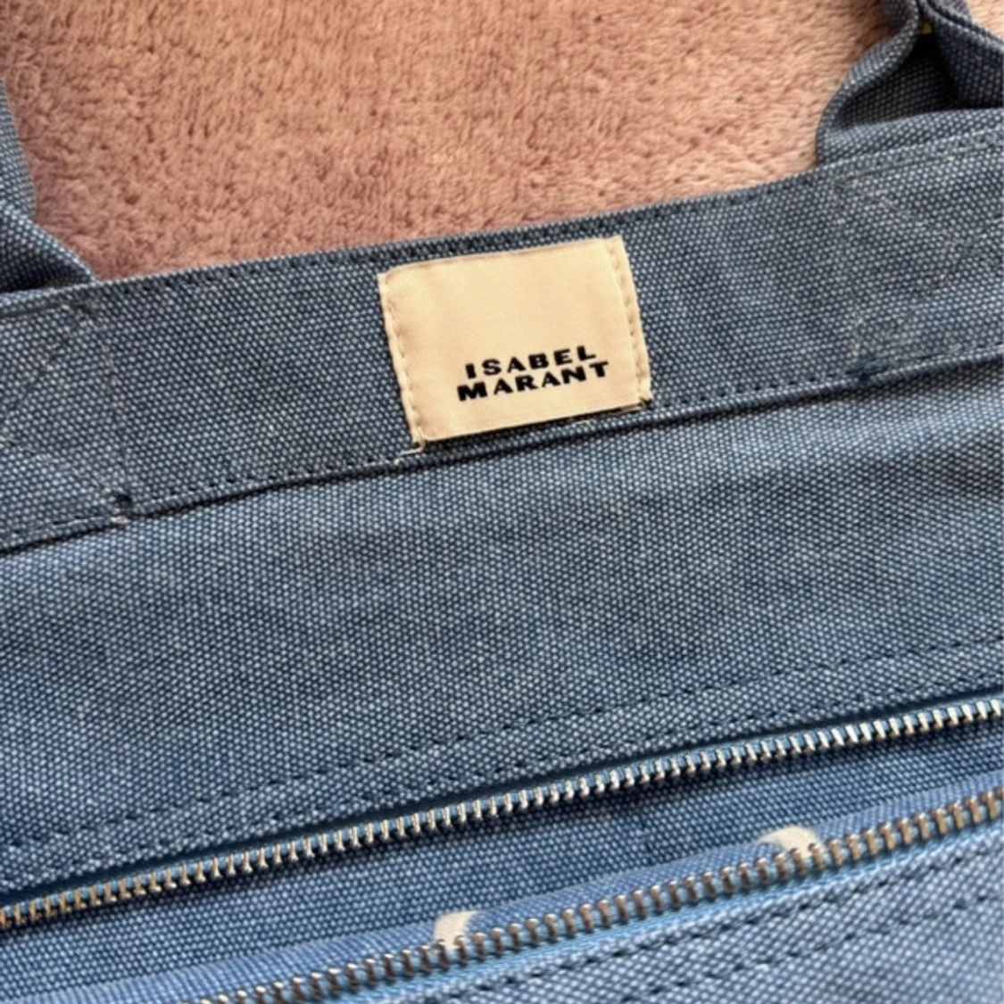 Snygg blå shoppingväska från Isabel Marant i jeansmaterial med stort vitt logotryck framtill. Väskan har dubbla handtag och rymligt fack med dragkedja inuti.