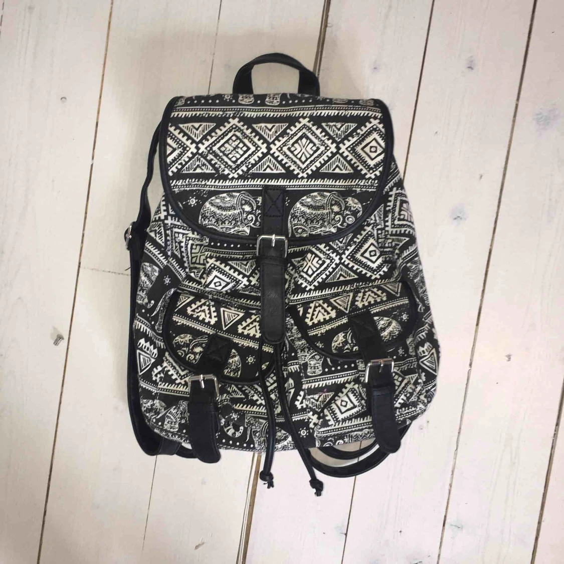 Svart- och vitmönstad ryggsäck från JFR med ett par olika fack. Toppskick, nypris typ 300-400
