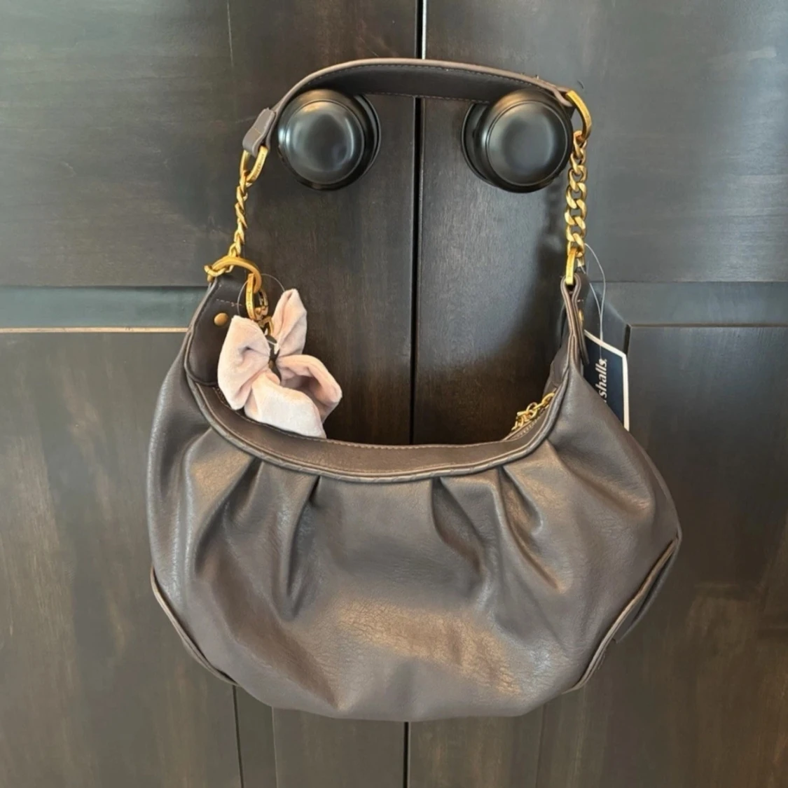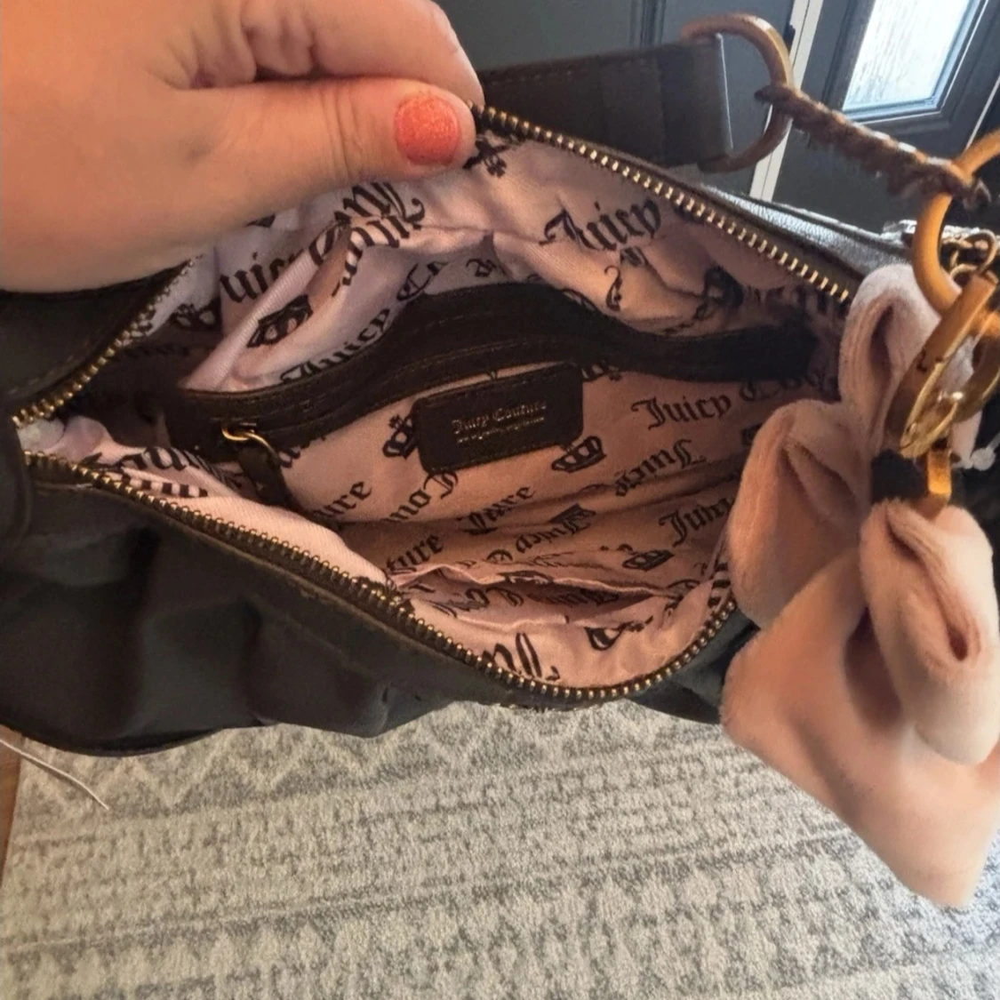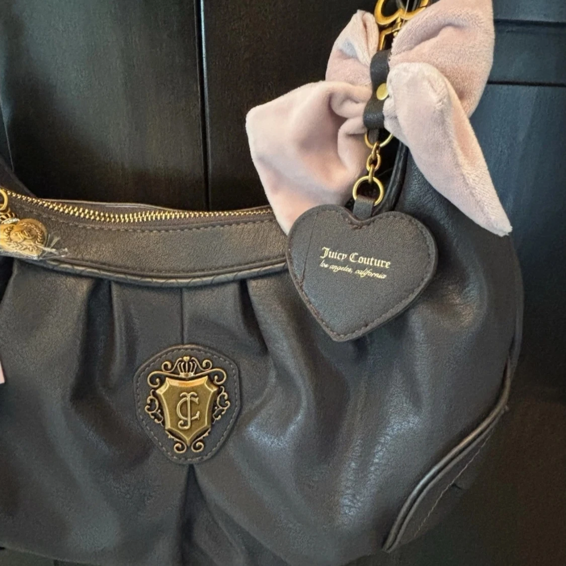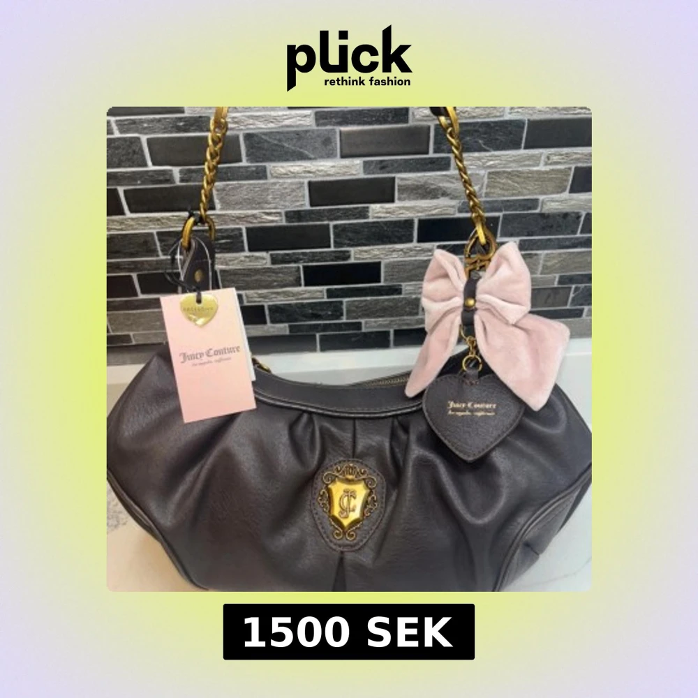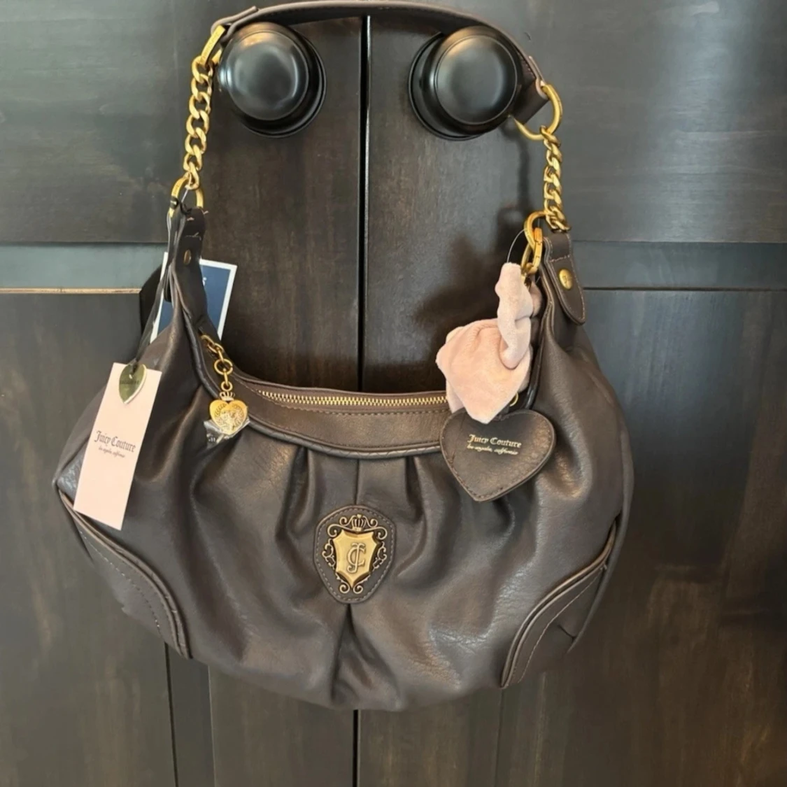 Mörkbrun axelväska från Juicy Couture i skinn med guldfärgade detaljer och kedja. Väskan har en stor ljusrosa rosett och hjärtformad tag med logga. Invändigt foder med Juicy Couture-tryck. Perfekt för dig som gillar statement-accessoarer.