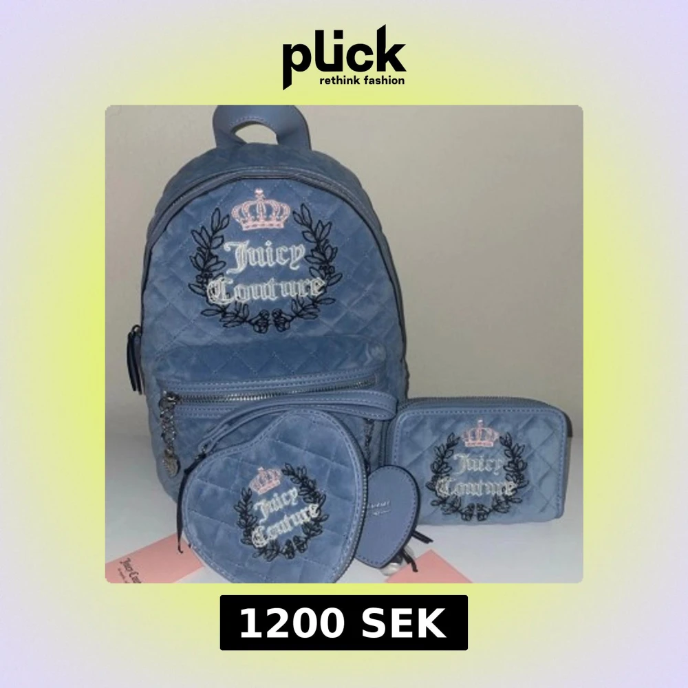 Superfint set från Juicy Couture med quiltad blå ryggsäck, matchande plånbok och hjärtformad liten väska. Alla delar har broderad krona och logga i vitt och rosa, samt svarta detaljer. Väskorna är i mjuk sammet och har dragkedjor med snygga detaljer.