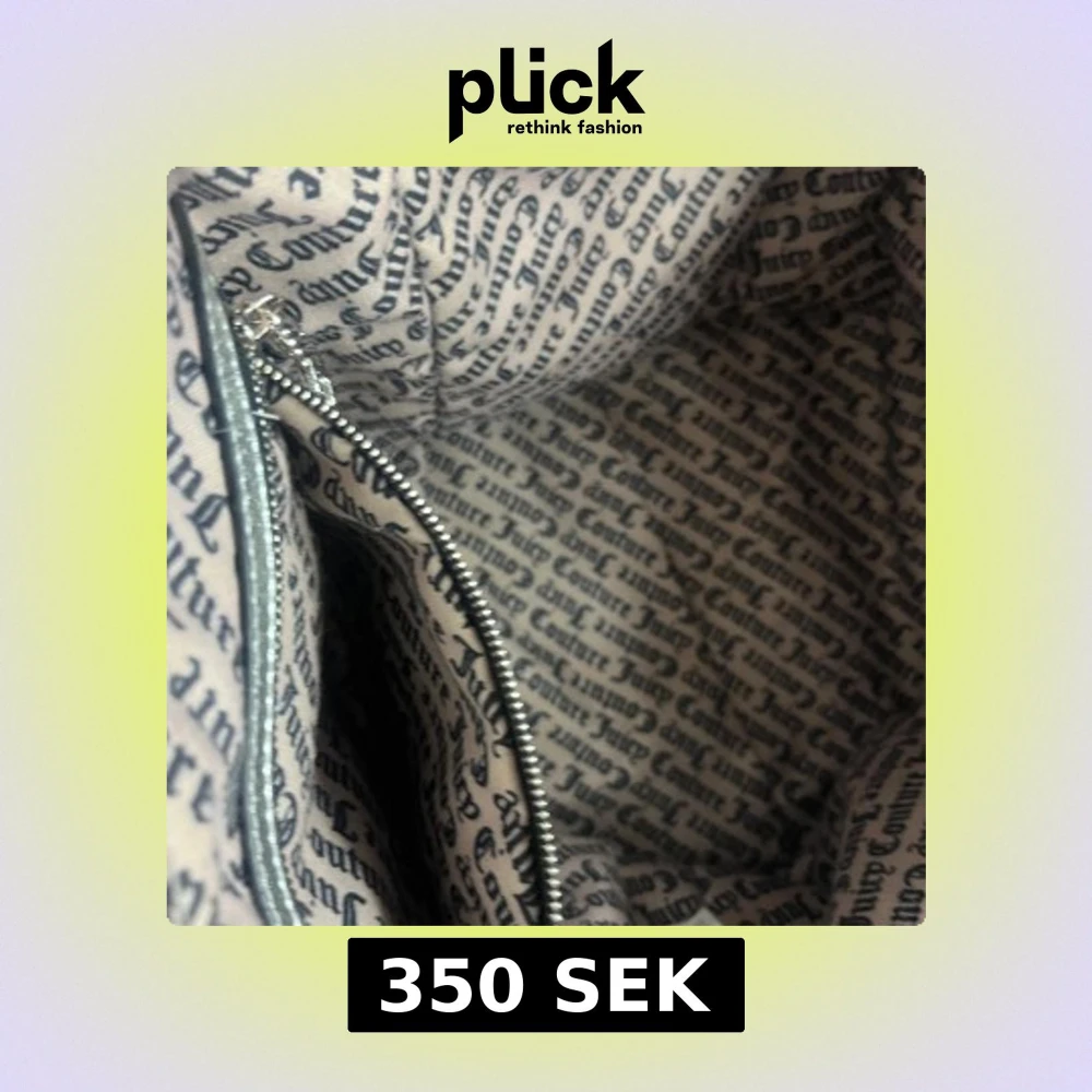 Juicy Couture shoppingväska i svart sammet med breda axelband och innerfoder med logotypmönster. Väskan har en innerficka med dragkedja och medföljande liten silverfärgad plånbok med Juicy Couture-logga i guld. Perfekt för dig som gillar statement-accessoarer.