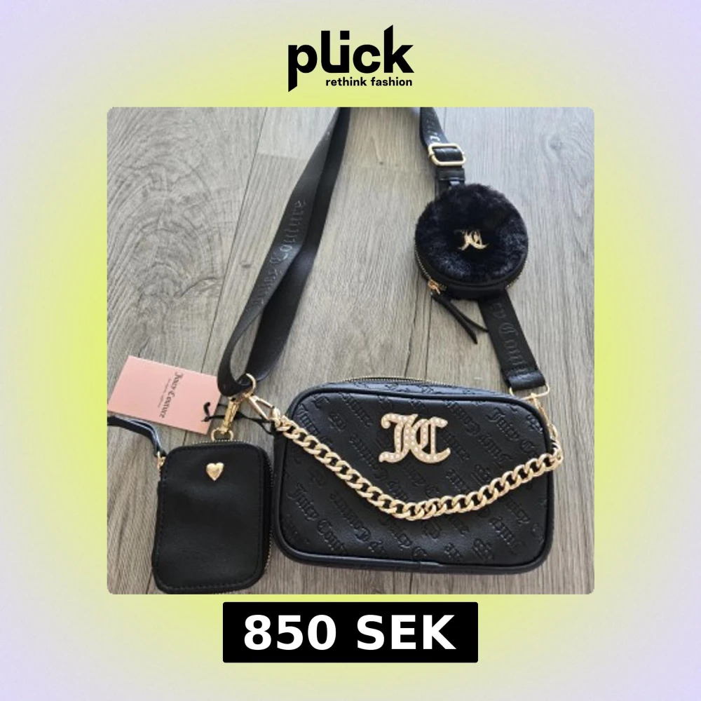 Snygg svart axelväska från Juicy Couture med präglad logga, guldfärgad kedja och JC-emblem med pärlor. Väskan har bred axelrem med logga, liten rund fuskpälsdetalj och extra fack med hjärtdetalj. Invändigt mönstrat foder med Juicy Couture-tryck.