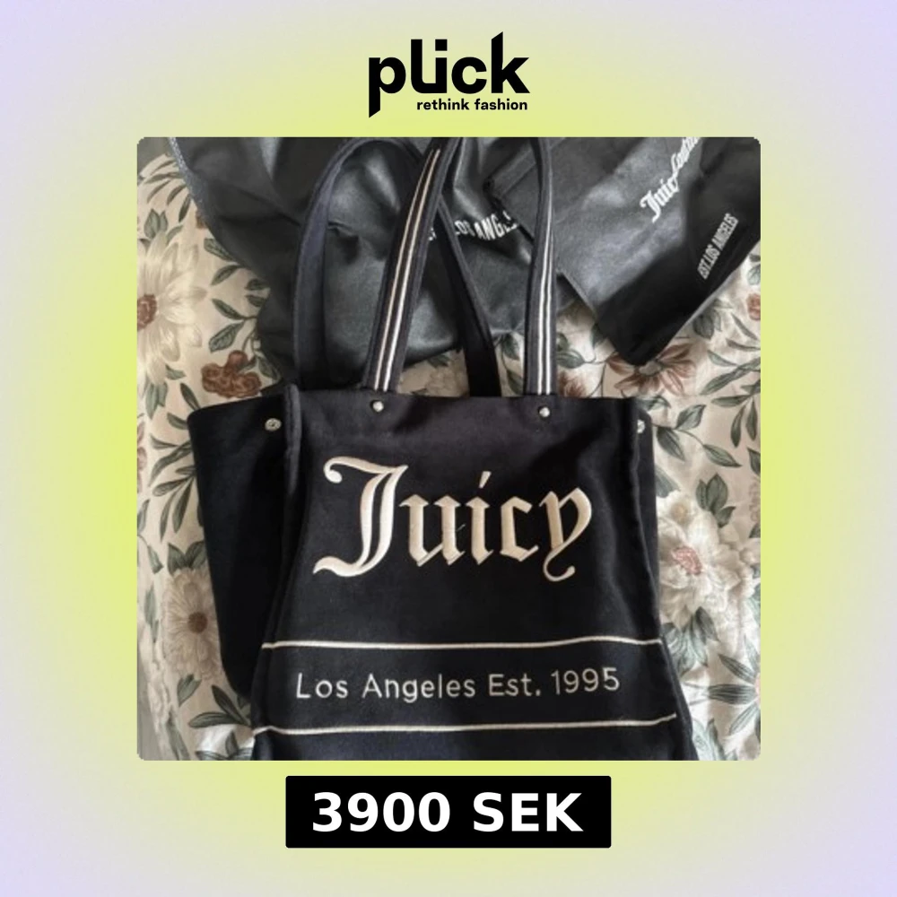 Snygg svart shoppingväska från Juicy Couture med texten 'Juicy Los Angeles Est. 1995' i vitt. Väskan har en praktisk dragkedja och kommer med en matchande liten vit plånbok med texten 'In Juicy We Trust'. Perfekt för att bära med sig allt man behöver.