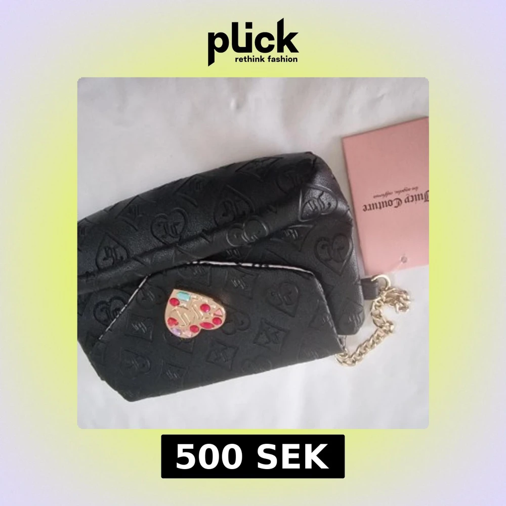 Kuvertväska från Juicy Couture i svart skinnimitation med präglade hjärtmönster och GG-loggor. Väskan har guldfärgad kedja och ett hjärtformat spänne med färgglada stenar. Insidan är fodrad med Juicy Couture-tryck i svart på vitt tyg.