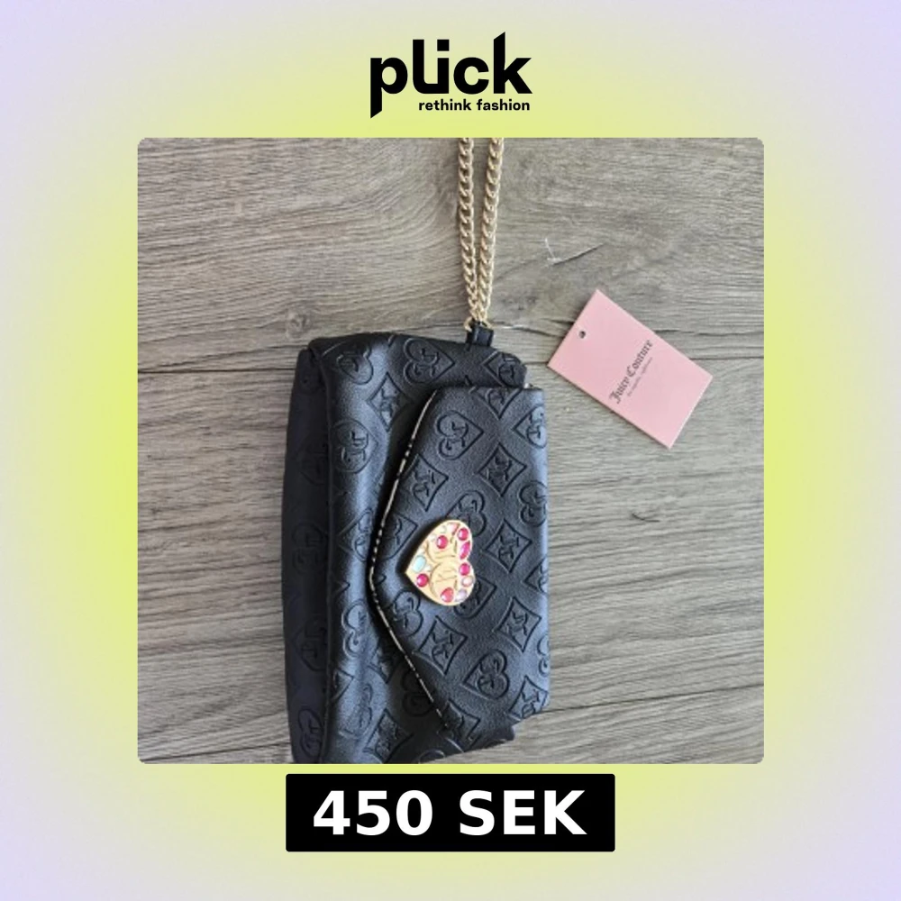Snygg svart axelväska från Juicy Couture i präglat skinn med JC-loggor och hjärtan. Väskan har guldfärgad kedja och ett hjärtformat spänne med färgglada stenar. Perfekt för dig som vill sticka ut med en unik accessoar.