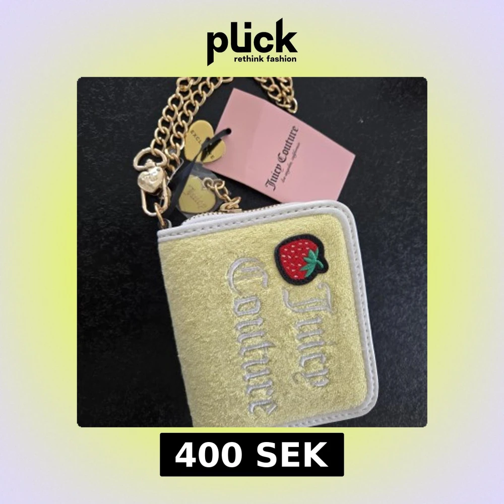 Superfin plånbok från Juicy Couture i ljusgul sammet med broderad logga och en söt jordgubbsdetalj. Baksidan har fack med fönster för kort, och insidan är fodrad i rosa med tryckt logga. Kedja i guld med hjärtberlocker ingår.