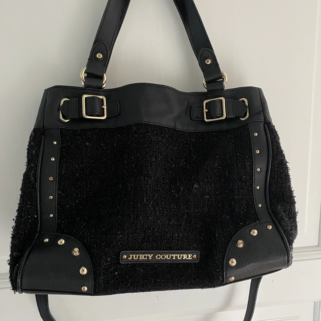 Väska fr Juicy Couture i nyskicka Längd 33 cm Höjd 25 cm Djup 16 cm Svart boucletyg med cerise fonder, dustbag medföljer
