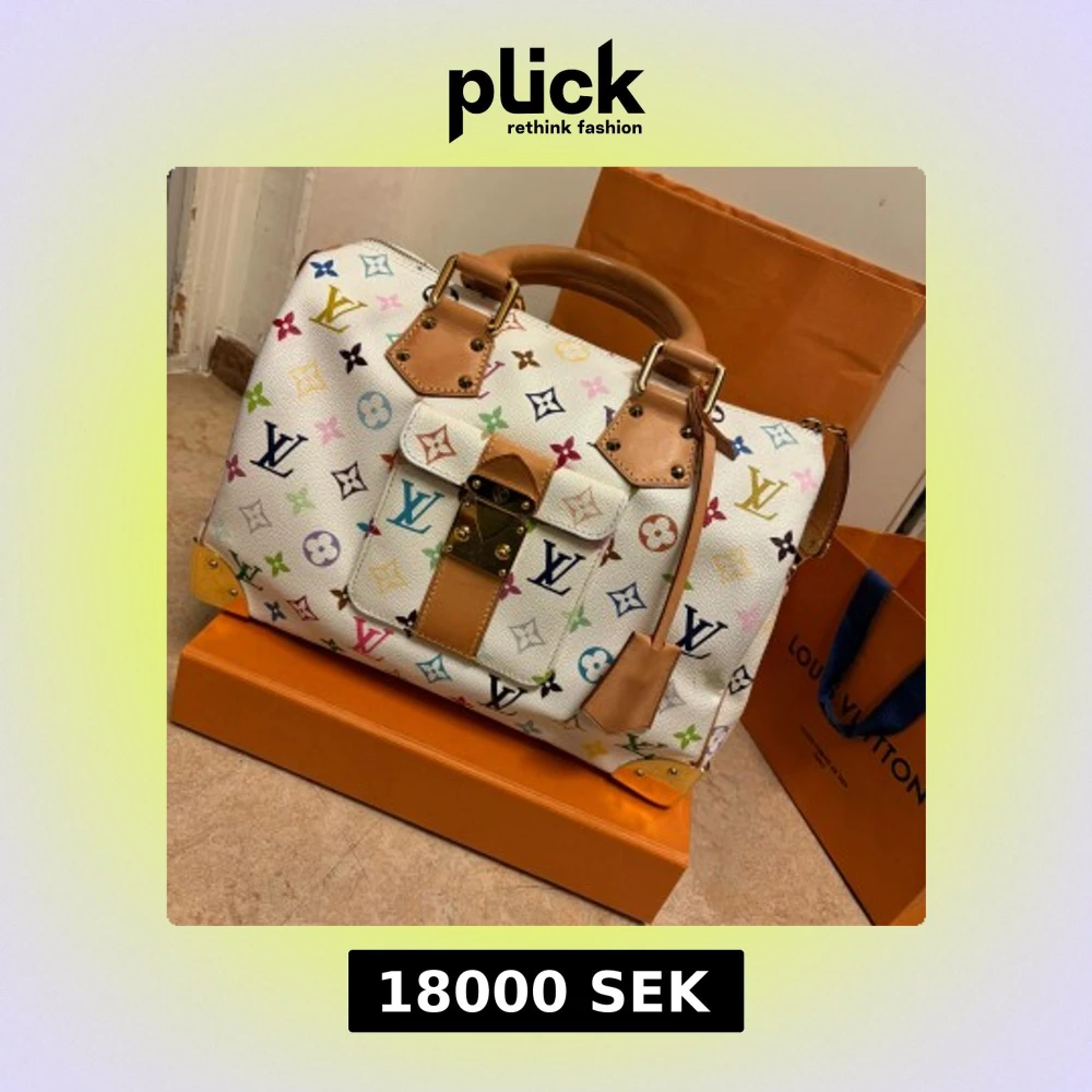 Snygg vit handväska från Louis Vuitton med ett färgglatt monogrammönster. Väskan har läderdetaljer och en dragkedja upptill. Perfekt för att ge din outfit en lyxig touch. Kvitto finns och den är knappt använd. Priset har ökat i värde sedan jag köpte den.