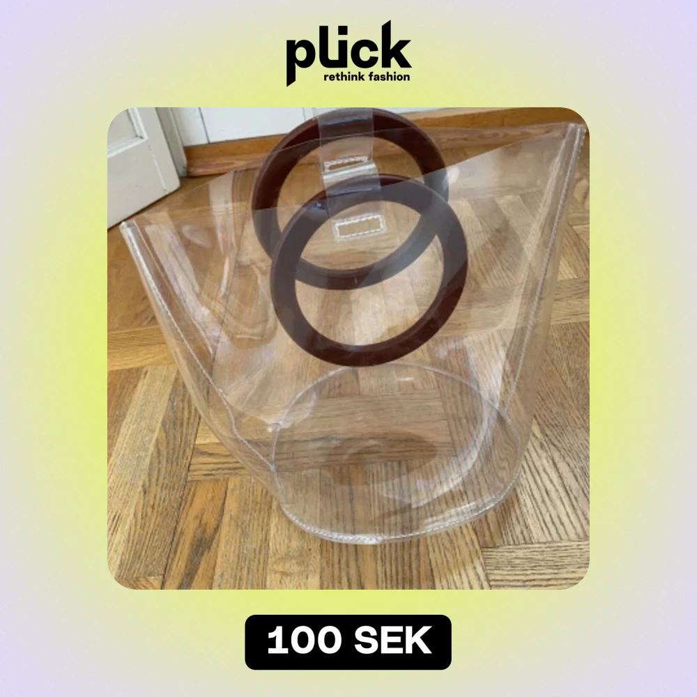 En stilren transparent handväska med runda bruna handtag. Väskan är tillverkad av genomskinligt material och har en modern design. Perfekt för att bära dina tillhörigheter med stil.