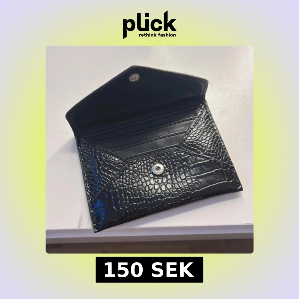 Snygg svart plånbok med krokodilmönster och tryckknapp. Perfekt för att hålla dina kort och kontanter organiserade. Stilren design som passar alla tillfällen.från Kappahl