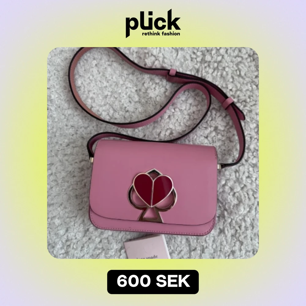 Superfin rosa Kate Spade-väska. Hjärtat är vridbart och man öppnar den genom att vrida på hjärtat. Serienumret syns på lappen på insidan. Den har ett fack för kort inuti samt ett fack på baksidan. Reglerbart axelband.