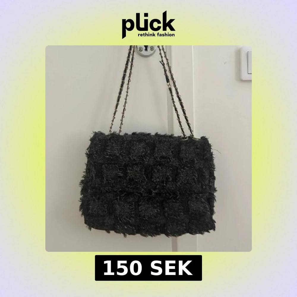 Säljer en svart axelväska med coolt rutigt och fransigt tyg. Väskan har en kedjerem i metall och läder, vilket ger en edgy vibe. Perfekt för dig som vill sticka ut med en unik accessoar. Rymmer mobil, plånbok och lite till.