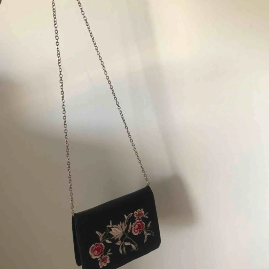 Svart väska med blommor på framsidan, tunn kedja som väskband
