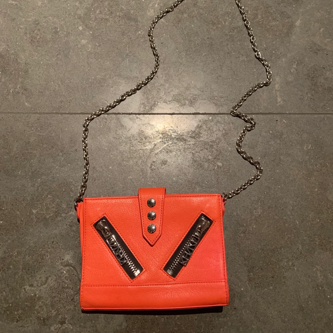 Kenzo - Mini Kalifornia bag Beskrivning: L: 19cm X H: 14cm X B: 2cm Peach färgad läder. Använt sparsamt. Pris: 800kr
