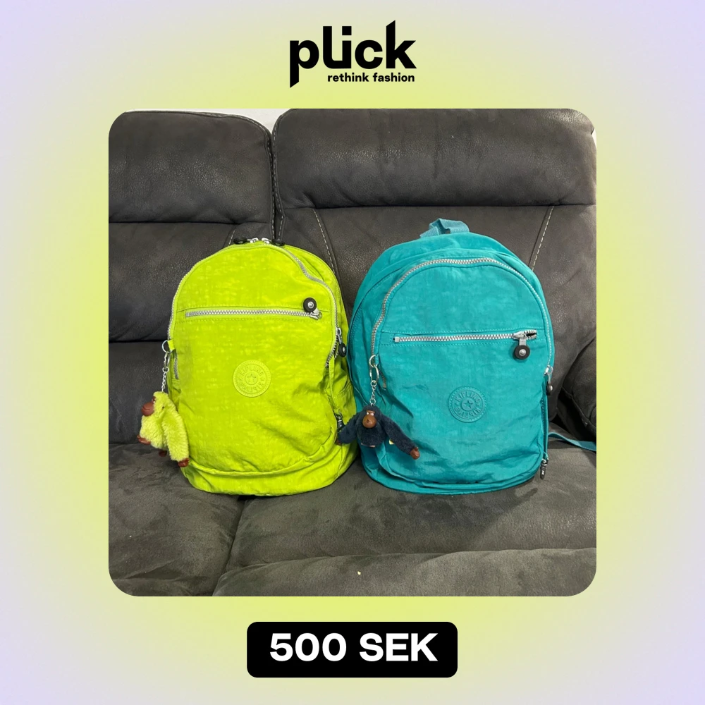 Två äkta kipling ryggsäckar i livliga färger, en limegrön och en turkos, med praktiska dragkedjor och en söt nyckelring i form av en apa. 500 kr styck, väldigt fint sick, inga skador