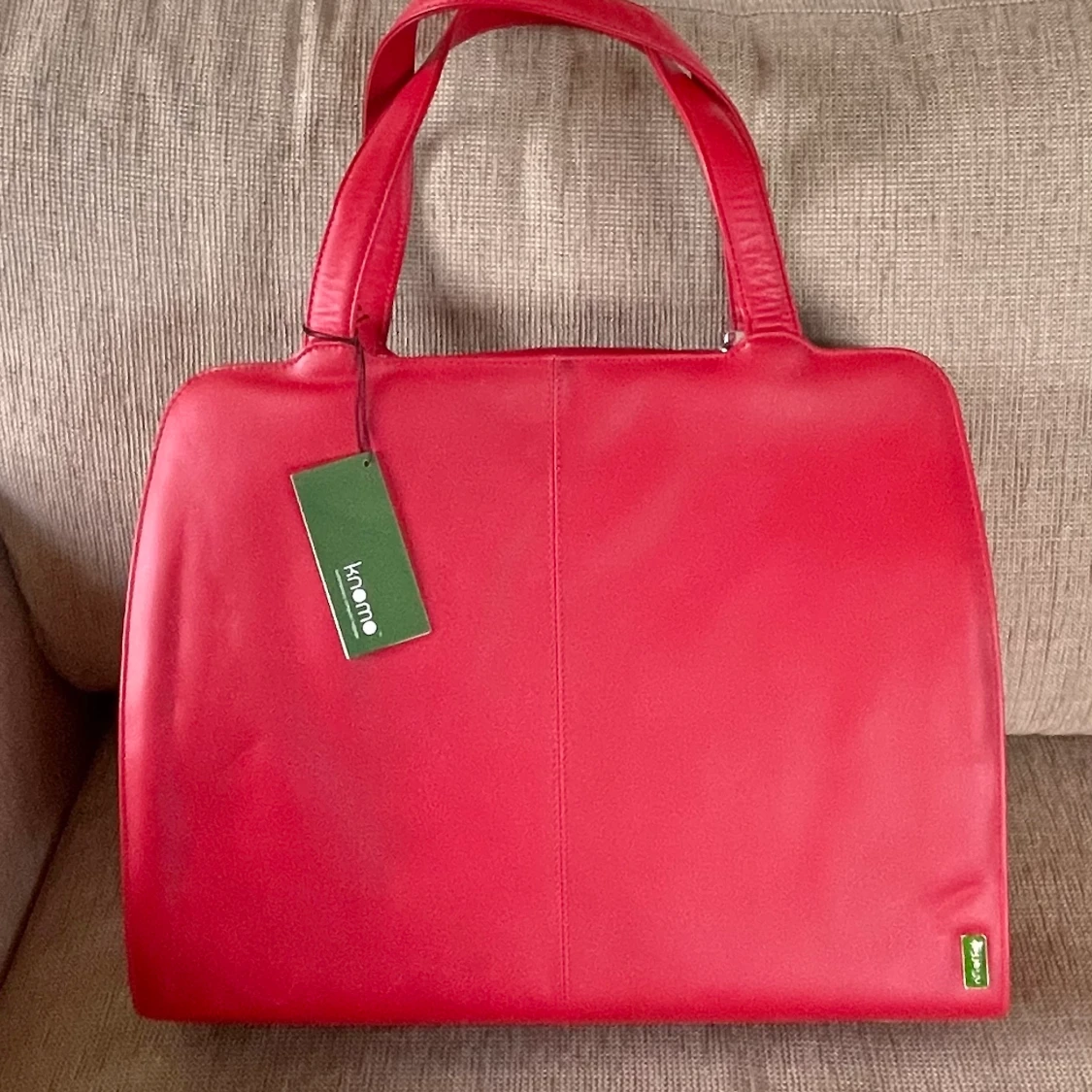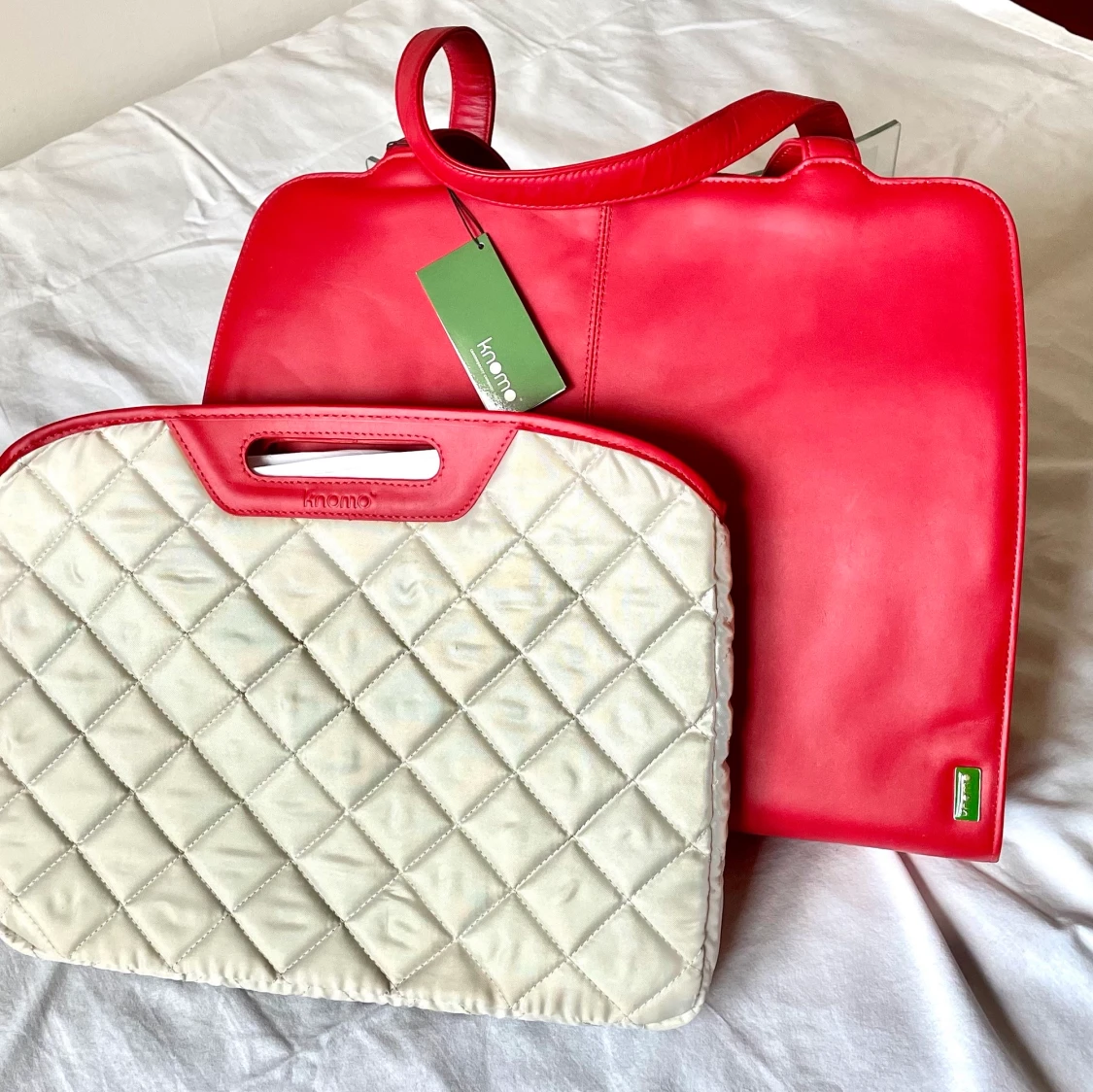 Praktiskt väska i härlig röd färg i äkta läder av märket Knomo - För din dagliga användning, oavsett om det är en dag på jobbet eller din lediga dag, med tillhörande datorväska som även kan användas separat. Helt NY, aldrig använd. Mått 41x32 Djup 13 cm