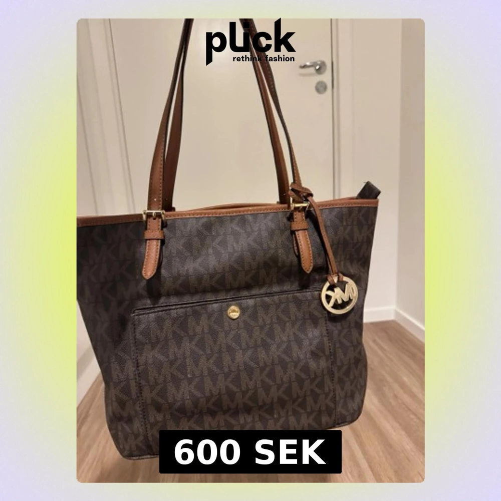 Snygg brun axelväska från Michael Kors med MK-logga i mönstret och guldfärgad detalj framtill. Väskan har långa handtag i brunt skinn, flera fack och dragkedja upptill. Insidan är fodrad med ljus textil med Michael Kors-tryck. Perfekt storlek för allt du behöver.