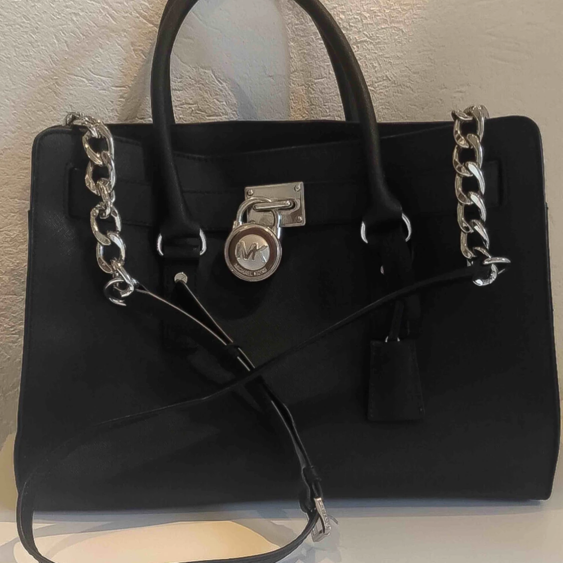 Saffinoläder, Silver och läderaxelrem (43cm) med två handtag. Väskan har flera fack inuti. Storleken på väskan är: 37 cm lång x 14 cm bred x 27 hög. Sparsamt använd! Köpare betalar frakt 🐯