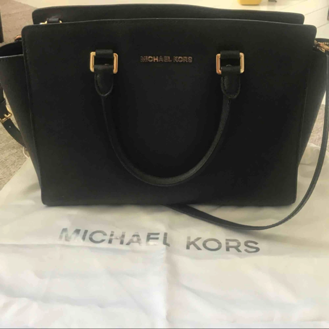 Äkta Michael Kors väska i modell Selma large. Den är i fint skick. Det finns några små fläckar på innertyget samt lite skavanker på metalldetaljerna. Inköpt på Macy’s.