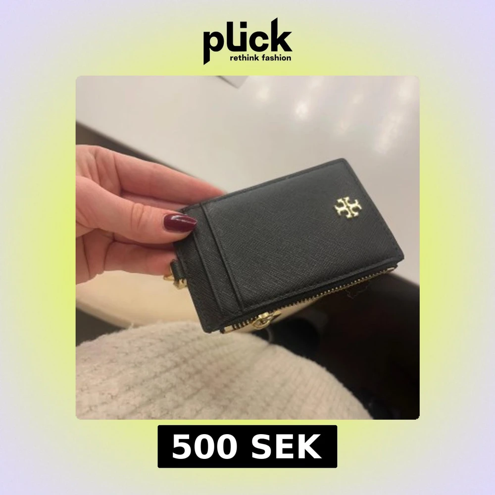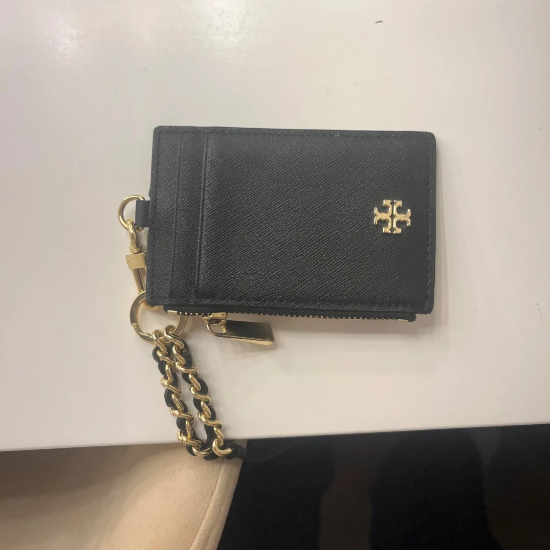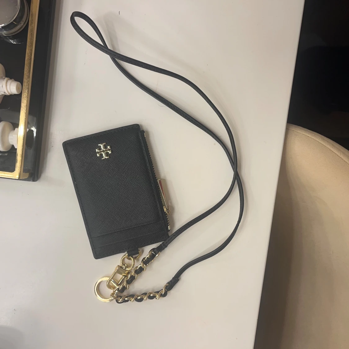 Stilren svart korthållare från Tory Burch i skinn med guldfärgad logga och detaljer. Det medkommer ett band som man kan fästa på väskan ifall man vill, den går även att ta bort. 🩷
