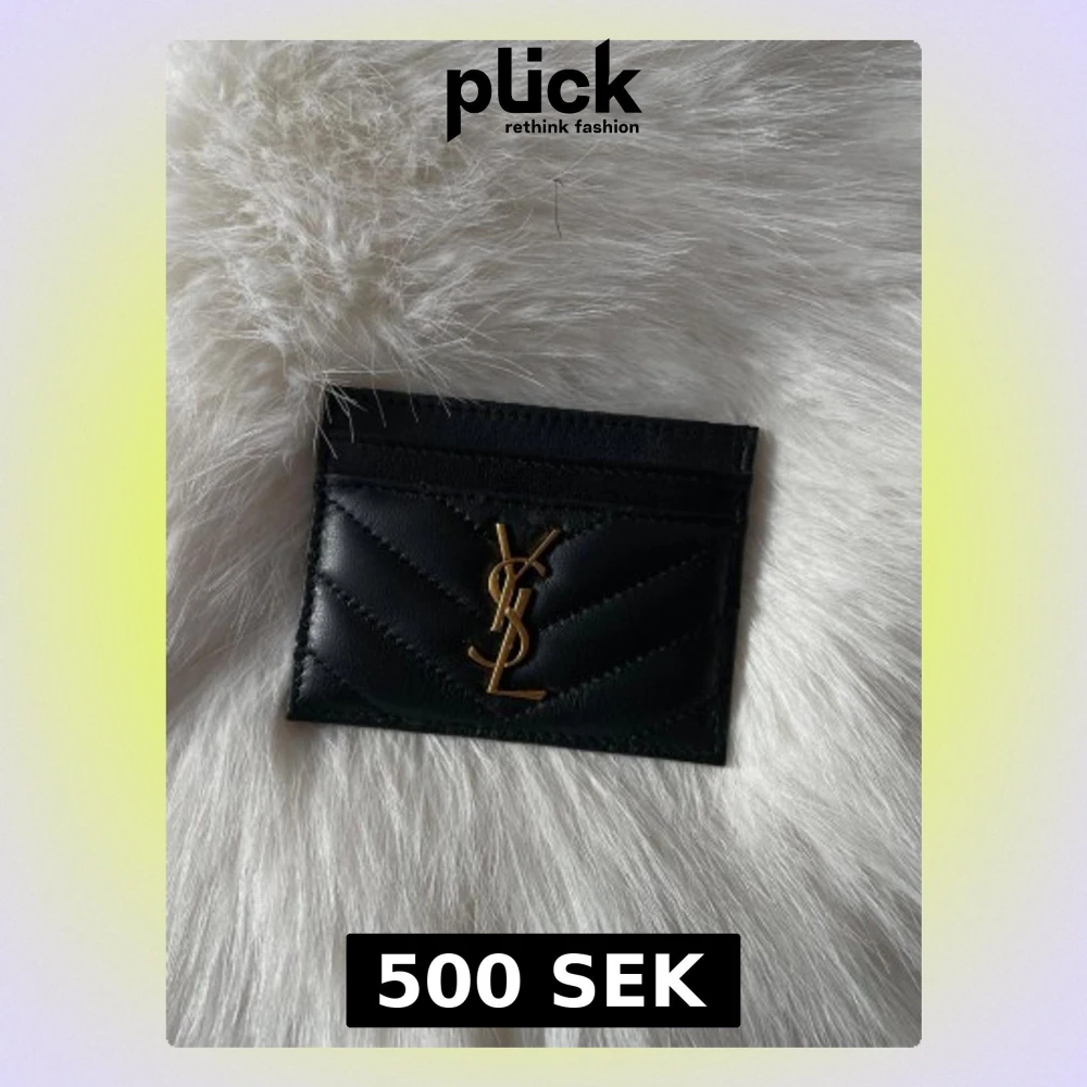 Säljer en svart quiltad plånbok med ikonisk guldlogga på framsidan. Plånboken är tillverkad i skinn och har flera fack för kort. Snygg och stilren design som passar perfekt i fickan eller väskan.