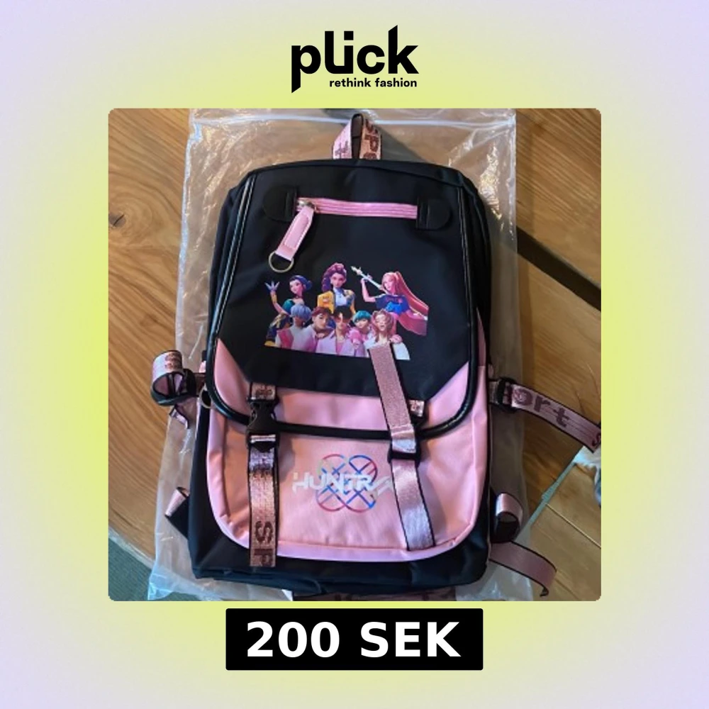 Helt ny, oanvänd! Cool KPop Demon Hunters ryggsäck i svart och rosa med anime-tryck på framsidan och texten HUNTRX. Flera fack, rosa detaljer och justerbara remmar. Kommer med hängdekoration i rosa och USB kabel. Praktisk dragkedja och snygg design.