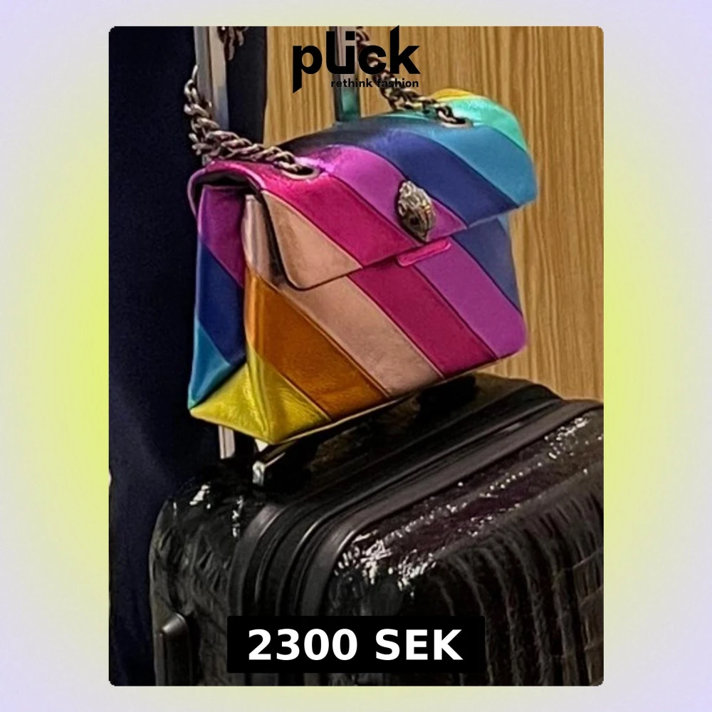 Säljer en färgstark axelväska i regnbågsrandigt mönster med metallic-finish. Väskan har kedjerem och coolt spänne framtill. Färgerna går i blått, rosa, gult, orange, lila och grönt. Perfekt statement piece för dig som vill sticka ut. INGA SKAVANKER ELLER NÅGOT- perfekt skick
