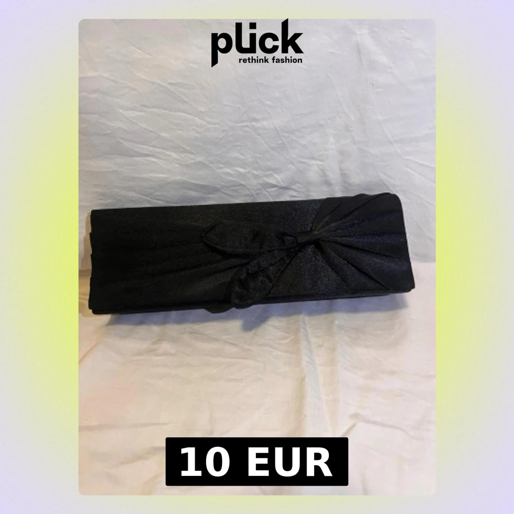 Elegant svart kuvertväska i satin med en dekorativ rosett framtill. Väskan har en avlång och stilren form, perfekt för att bära det viktigaste. Materialet har en lätt glansig finish som ger en lyxig känsla. Skedjan är borttappad.