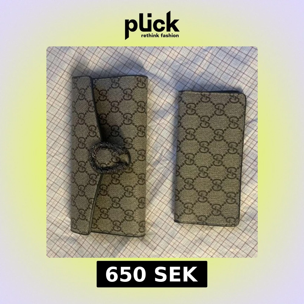 Säljer en snygg kuvertväska och matchande plånbok med klassiskt GG-monogram i beige och brunt. Väskan har ett coolt spänne med ormdetalj i metall och insidan har flera kortfack. Perfekt för dig som gillar lyxiga accessoarer med ikonisk design.