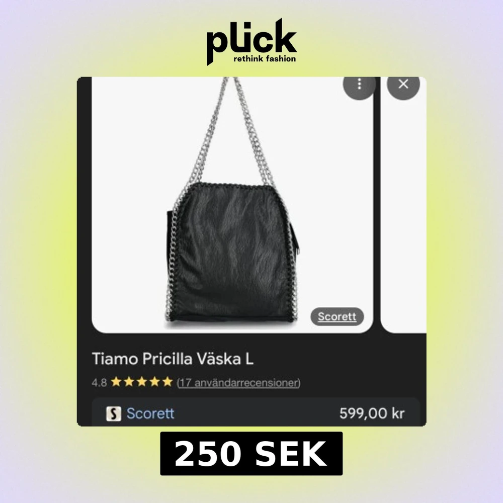 Säljer en svart axelväska från Tiamo med silverfärgade kedjor som axelrem och detaljer längs kanterna. Väskan är gjord i syntetmaterial med en grynig läderlook, har dragkedja både på utsidan och insidan samt flera fack för småprylar.