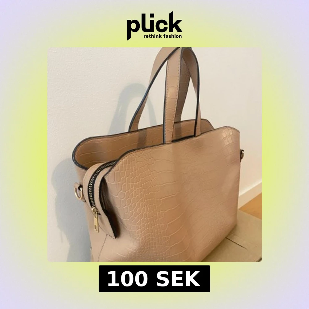 Säljer en beige axelväska med krokodilpräglat mönster och svarta kanter. Väskan har dubbla handtag och en stor dragkedjeförsedd innerficka. Perfekt för att bära med sig allt man behöver till vardags.