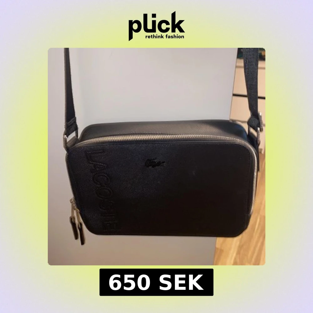 Snygg svart axelväska från Lacoste med präglad logga på framsidan och silverfärgad dragkedja. Väskan har en stilren, rektangulär form och justerbar axelrem. Tillverkad i tåligt syntetmaterial och har ett rymligt huvudfack med innerficka för småsaker.